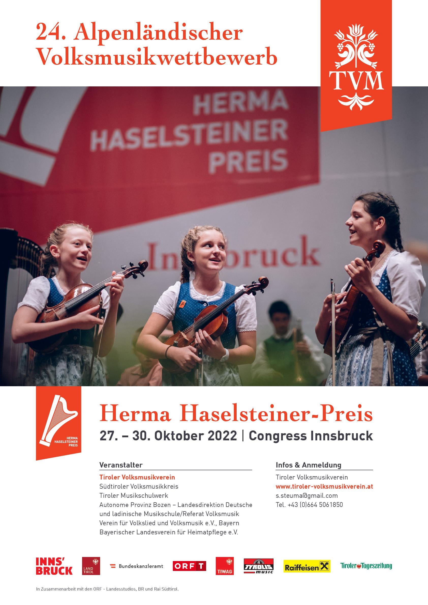 Die Ausschreibung, das Anmeldeformular sowie alle weiteren Informationen zum 24. Alpenländischen Volksmusikwettbewerb/Herma Haselsteiner-Preis sind auf der Website des Tiroler Volksmusikvereins
