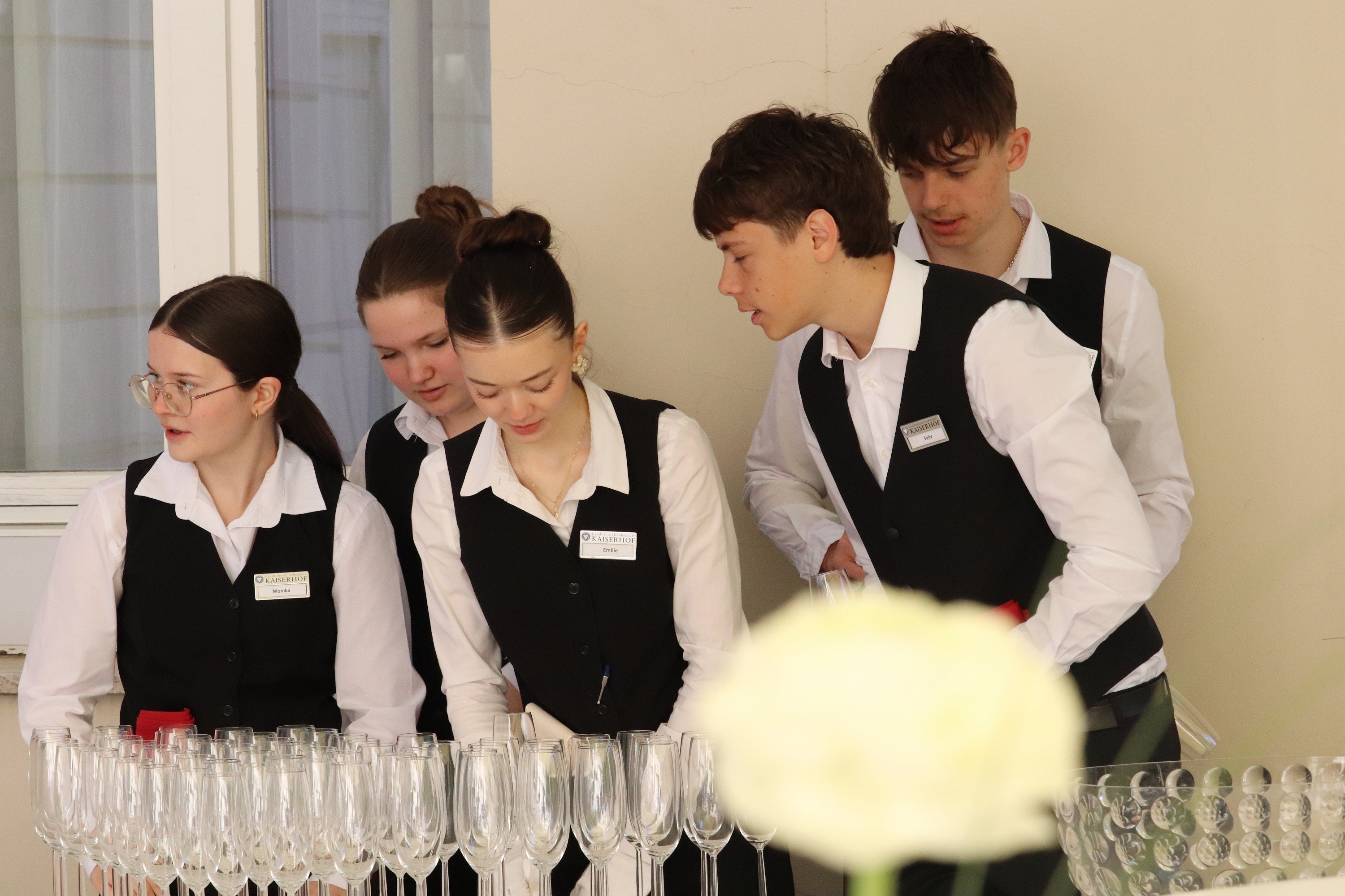 - Mit Freude bei der Ausbildung in Restaurantführung an der Landeshotelfachschule Kaiserhof, in Vorbereitung des Umtrunks nach der Jubiläumsfeier. (Foto: LPA/Maja Clara) » [IMG 1 MB]
