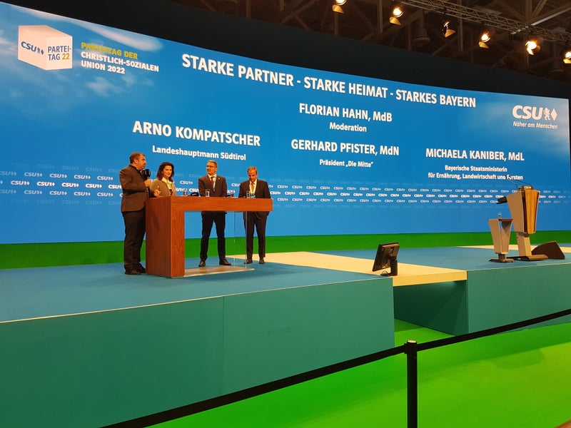Der Klimawandel, die Biodiversitäts- und Ressourcenkrise, der Angriffskrieg gegen die Ukraine und die Auswirkungen der immer noch nicht völlig überwundenen Pandemie stellen die Alpenregionen gleichermaßen vor große Herausforderungen. Von Südtirol über die Schweiz bis nach Bayern stehen derzeit die politischen Agenden ganz im Zeichen der Bewältigung dieser Krisensituationen. Auf Einladung der CSU Bayern und des bayerischen Ministerpräsidenten und CSU-Vorsitzenden Markus Söder hat Südtirols Landeshauptmann Arno Kompatscher auf dem CSU-Parteitag in Augsburg mit der bayerischen Staatsministerin Michaela Kaniber, dem Schweizer Nationalrat und "Die Mitte"-Präsident, Gerhard Pfister, sowie dem CSU-Bundestagsabgeordneten Florian Hahn über die Herausforderungen und Zukunft der Alpenregionen debattiert. Mit Kaniber, Pfister und Hahn stimmte Kompatscher auf dem heutigen Panel "Zukunft der Alpenregionen" darin überein, dass schnelles und effizientes Handeln in der gegenwärtigen Krisensituation unabdingbar sei.