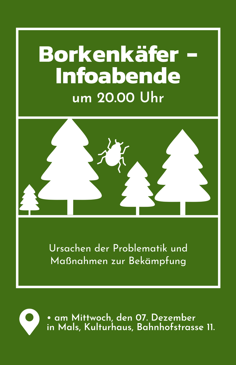 Aufgrund der großen Nachfrage wird es weitere Veranstaltung zum Borkenkäfer im Obervinschgau geben: Der Infoabend findet bei freiem Eintritt am Mittwoch, 7. Dezember 2022 mit Beginn um 20 Uhr in Mals, Kulturhaus, Bahnhofstrasse 11 statt.