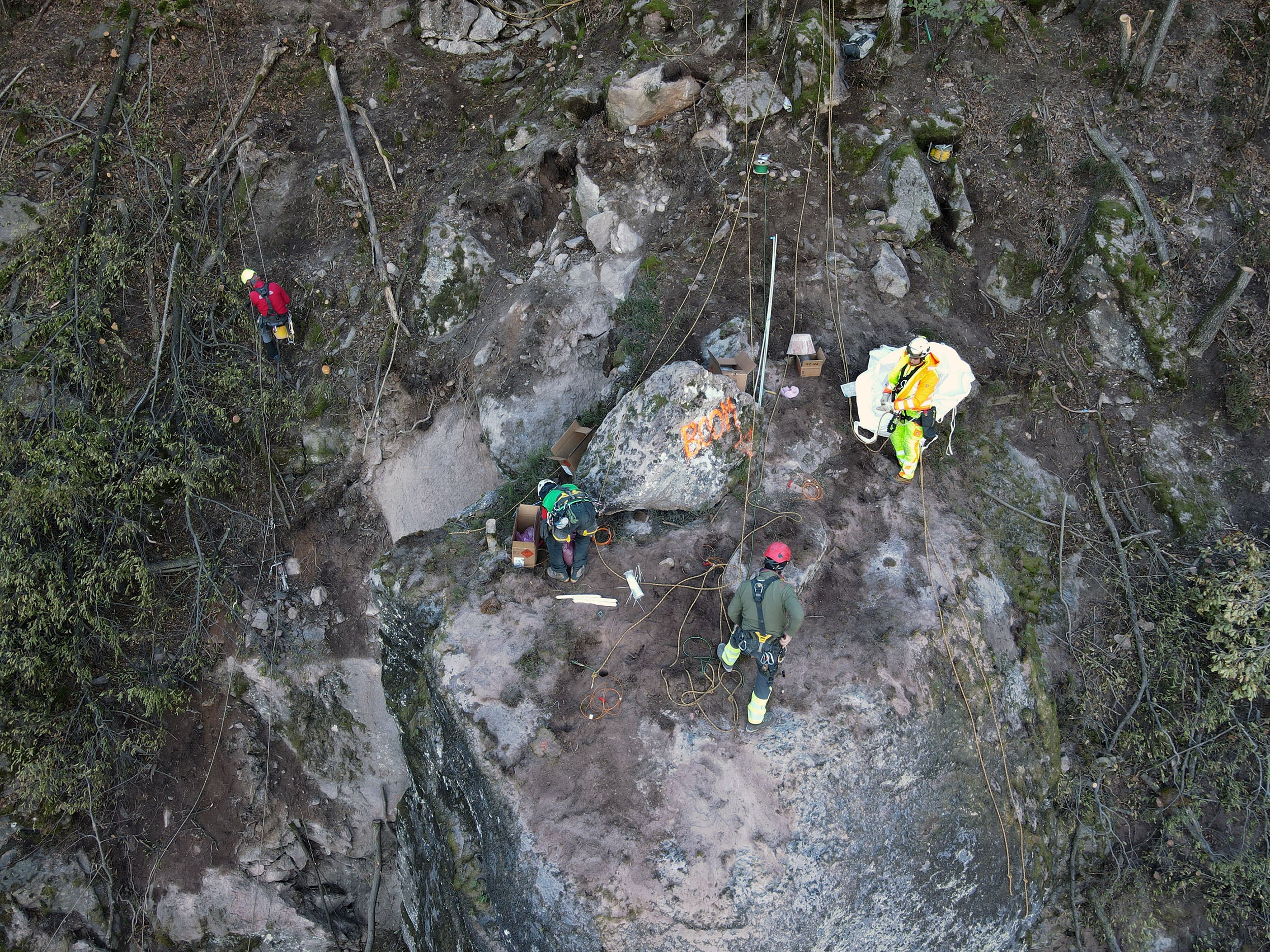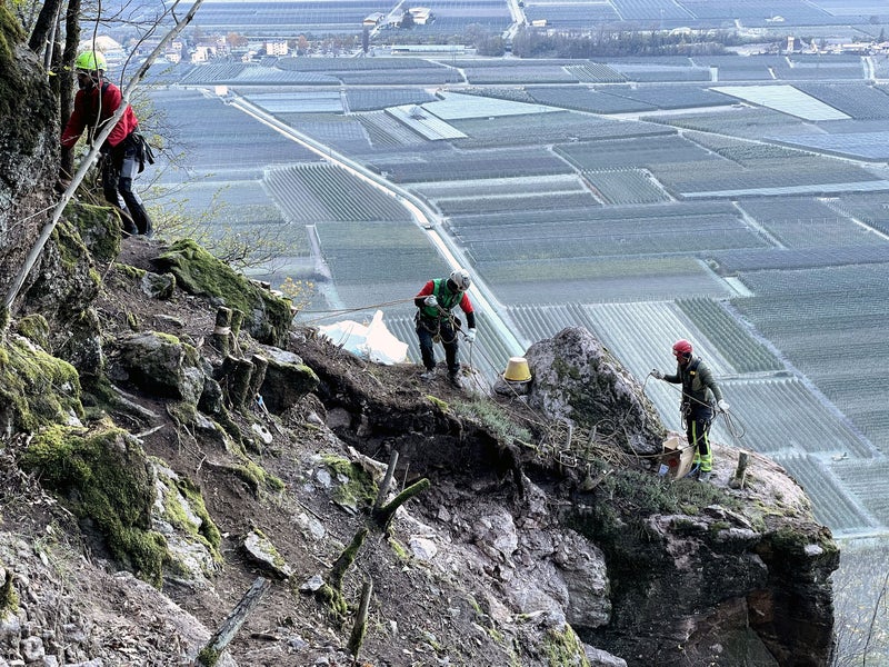 - Unter Anleitung von Sprengmeister Giacomo Nardin wurden die Sprengladungen am Felsblock angebracht. (Foto: LPA/gnews) » [IMG 1 MB]