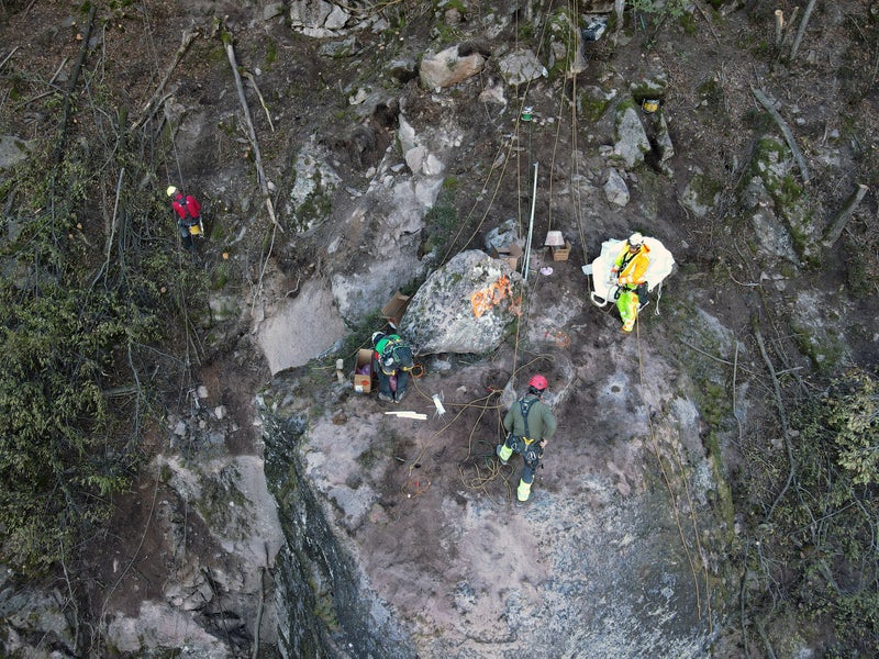 - Eigens ausgebildete Felskletterer waren bei der kontrollierten Felssprengung in Auer im Einsatz. (Foto: LPA/gnews) » [IMG 1 MB]