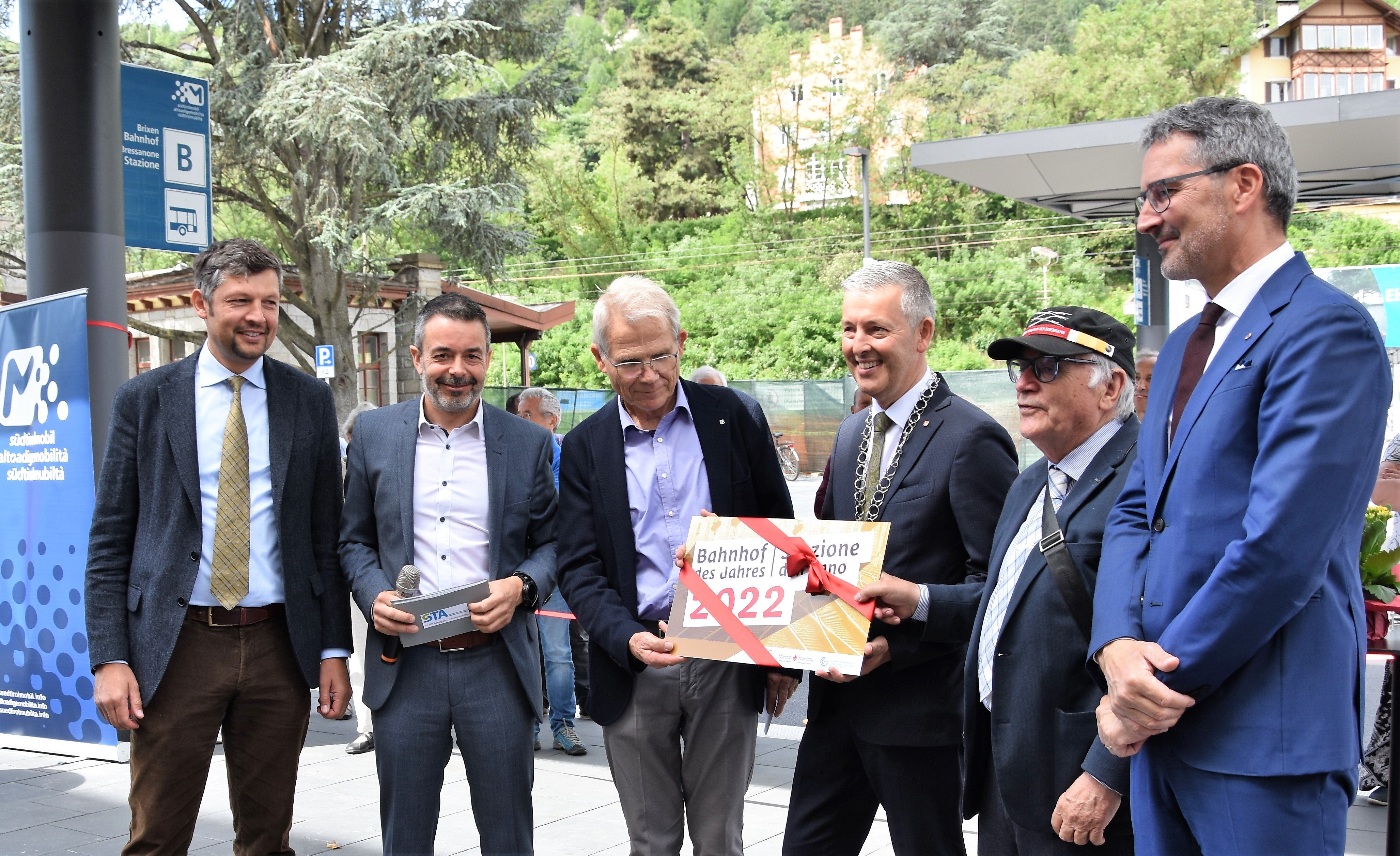 - Doppelter Grund zum Feiern: Das Mobilitätszentrum Brixen wird eröffnet und der Bahnhof Brixen bekommt die Auszeichnung "Bahnhof des Jahres": LR Alfreider, STA-Chef Dejaco, Tutzer (Freunde der Eisenbahn), BM Brunner, der Präsident des Vereins "Freunde der Eisenbahn) und LH Kompatscher. (Foto: LPA/Angelika Schrott) » [IMG 2 MB]