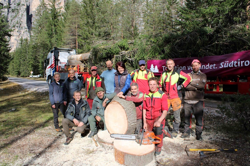 "Es war nicht einfach, einen Baum zu finden, der den Anforderungen entspricht", sagt Andreas Agreiter, Bereichsleiter des Forstbetriebs der Agentur Landesdomäne. Der Baum sollte regelmäßige Seitenäste haben, 25 bis 28 Meter hoch sein und logistisch günstig gelegen. "Diesen Baum haben die Förster im Rautal im Naturpark Fanes-Sennes-Prags gefunden. Heute haben wir ihn gefällt und in vorsichtiger Handarbeit die Seitenäste an den Stamm gebunden, sodass der Baum beim Aufstellen wieder so schön ist wie jetzt an seinem Standort im Wald", erläutert Agreiter. Aufgrund von Baustellen auf der Reise nach Wien darf die Breite des Transportguts 3,5 Meter nicht überschreiten. Die Fichte wurde vom Enneberger Bürgermeister Felix Ploner und einer Delegation des Dorfes samt Baumfällerteam feierlich verabschiedet und ist nun als Sondertransport unterwegs nach Wien. In gut zwei Wochen wird sie als Christbaum geschmückt erstrahlen.