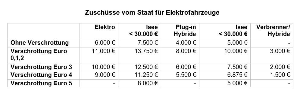 - Übersicht über die Zuschüsse des Staats (Ecobonus) für Elektrofahrzeuge. (Quelle: Sta) » [IMG 61 kB]