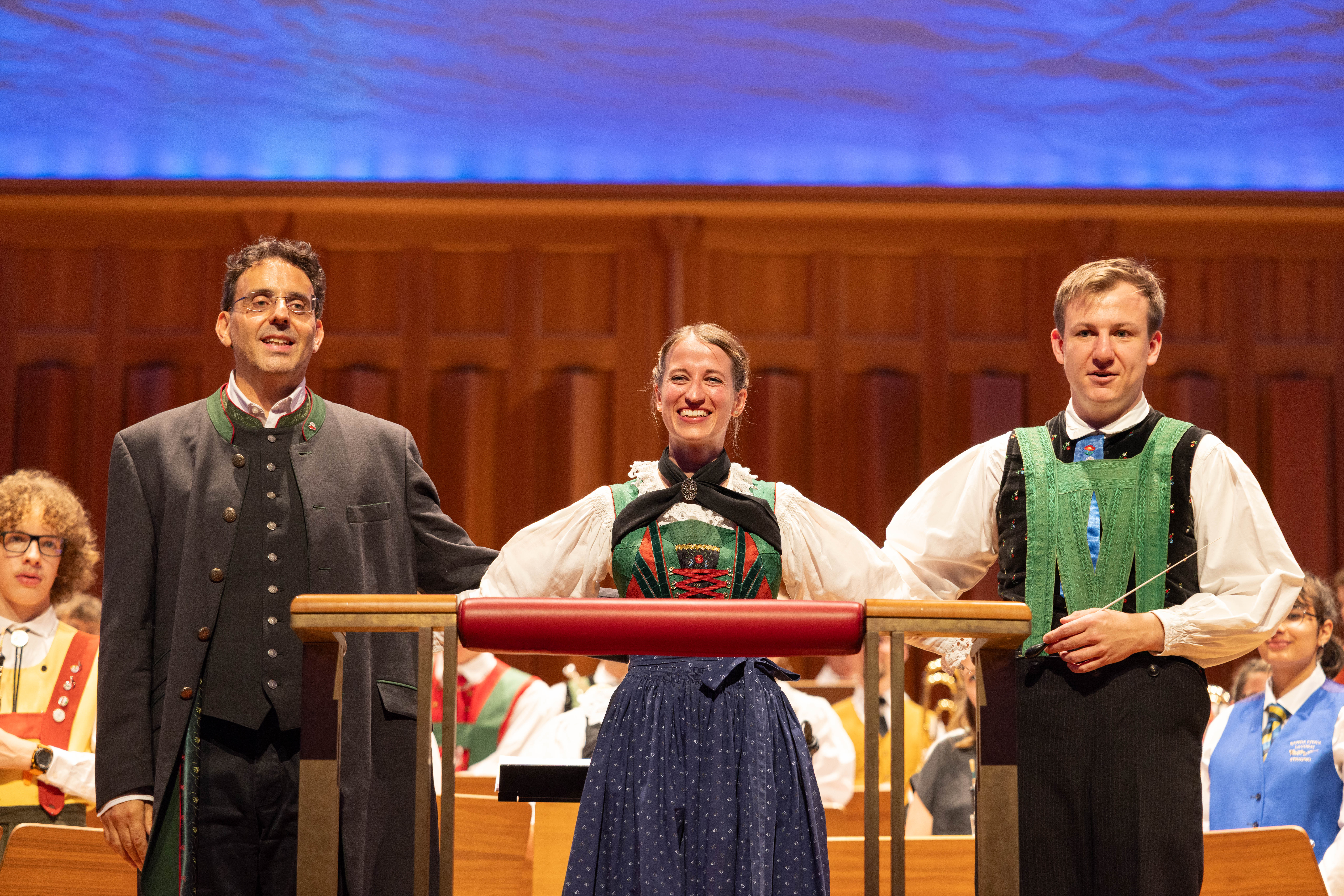 - Die musikalische Leitung lag bei (v.r.) Hannes Schrötter (Südtirol), Manuela Lusser (Osttirol), die als erste Frau und erste Vertreterin Osttirols das Orchester dirigierte, und Franco Puliafito (Trentino). (Foto: Euregio/Max Verdoes) » [IMG 5 MB]
