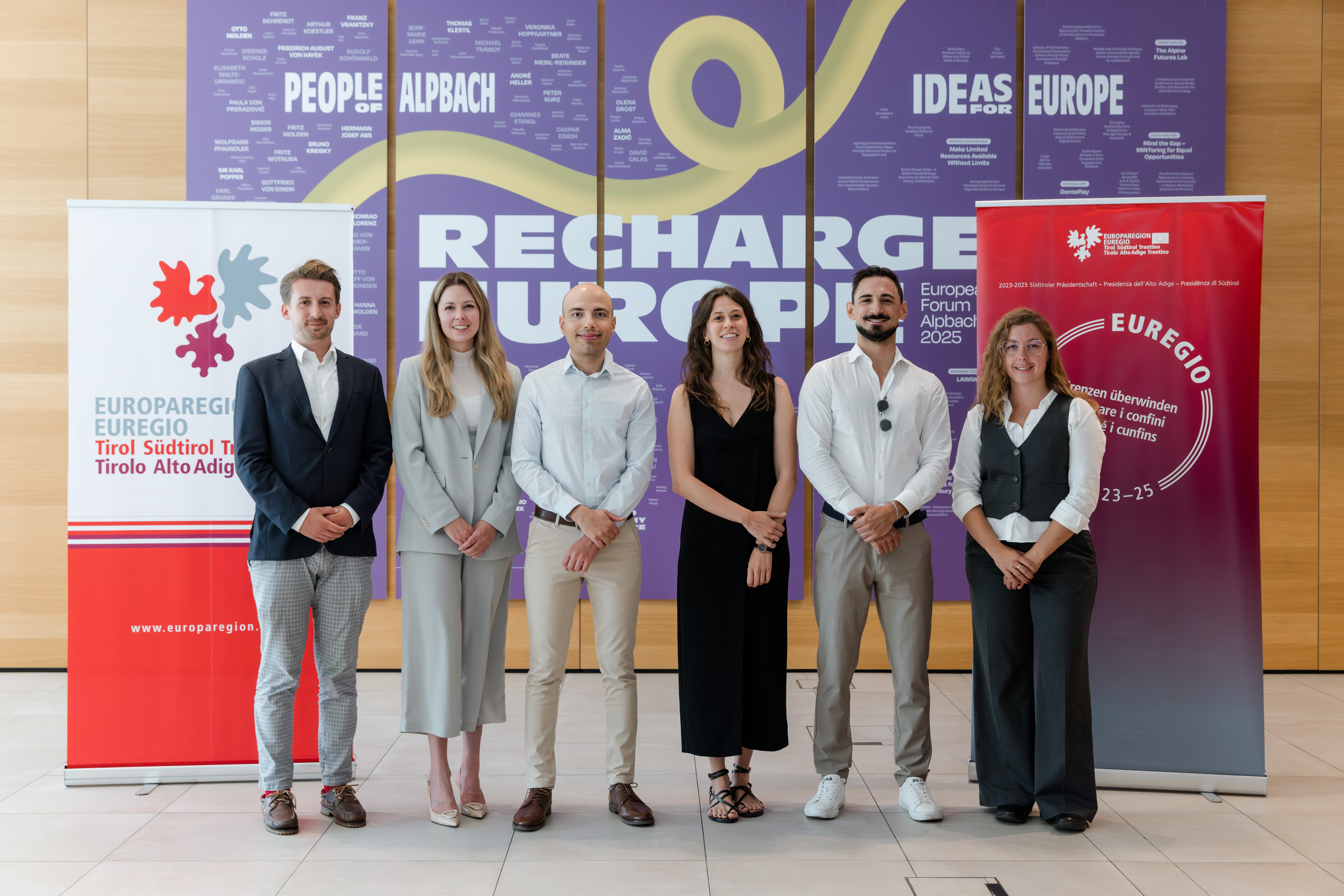 - Euregio JungforscherInnenpreis 2025: die sechs Finalisten (v. l.) Valentin Wett, Julia Hofmann (3. Platz), Saleh Hamed, Elena Fogazzi (2. Platz), Marco Turrini und Eva Casotti (1. Platz). (Foto: EFA/Philipp Huber) » [IMG 4 MB]