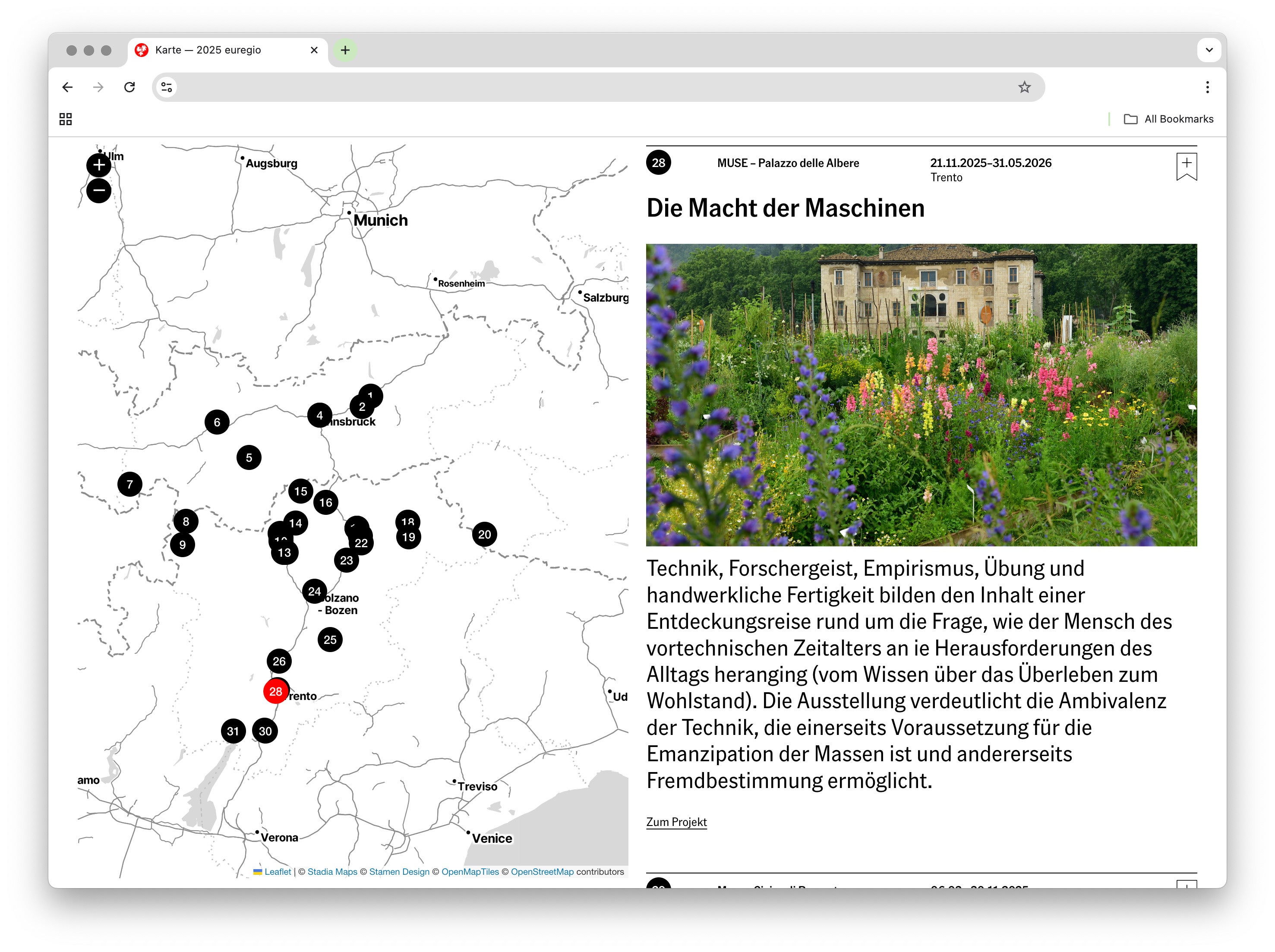 Herzstück der Museumsjahr-Website unter https://2025.euregio.info/ ist die Übersicht über alle Publikumsangebote, die im Lauf des Jahres an 31 Standorten in allen Ländern der Euregio Tirol-Südtirol-Trentino zu sehen sein werden. Auf einer Karte des Euregio-Gebietes sind diese leicht dem jeweiligen Ausstellungsort zuzuordnen, und ein Kalender liefert alle aktuellen Termine dazu.