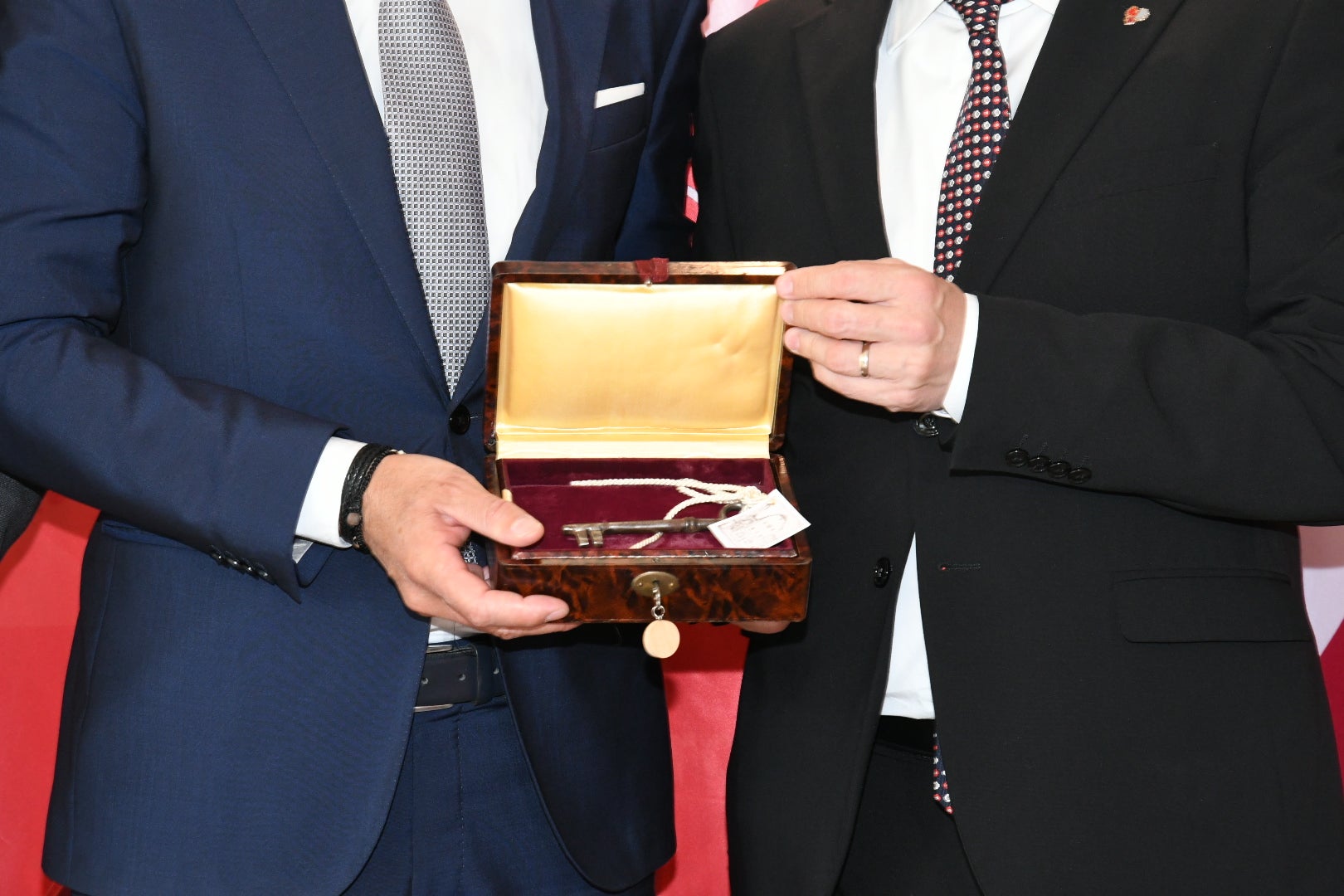 - Im Rahmen der heutigen EVTZ-Vorstandssitzung hat der scheidende Euregio-Präsident seinem Nachfolger die Schlüssel zum Waaghaus in Bozen übergeben, wo die Euregio ihren Hauptsitz hat. (Foto: Euregio/Presseamt Trentino) » [IMG 70 kB]