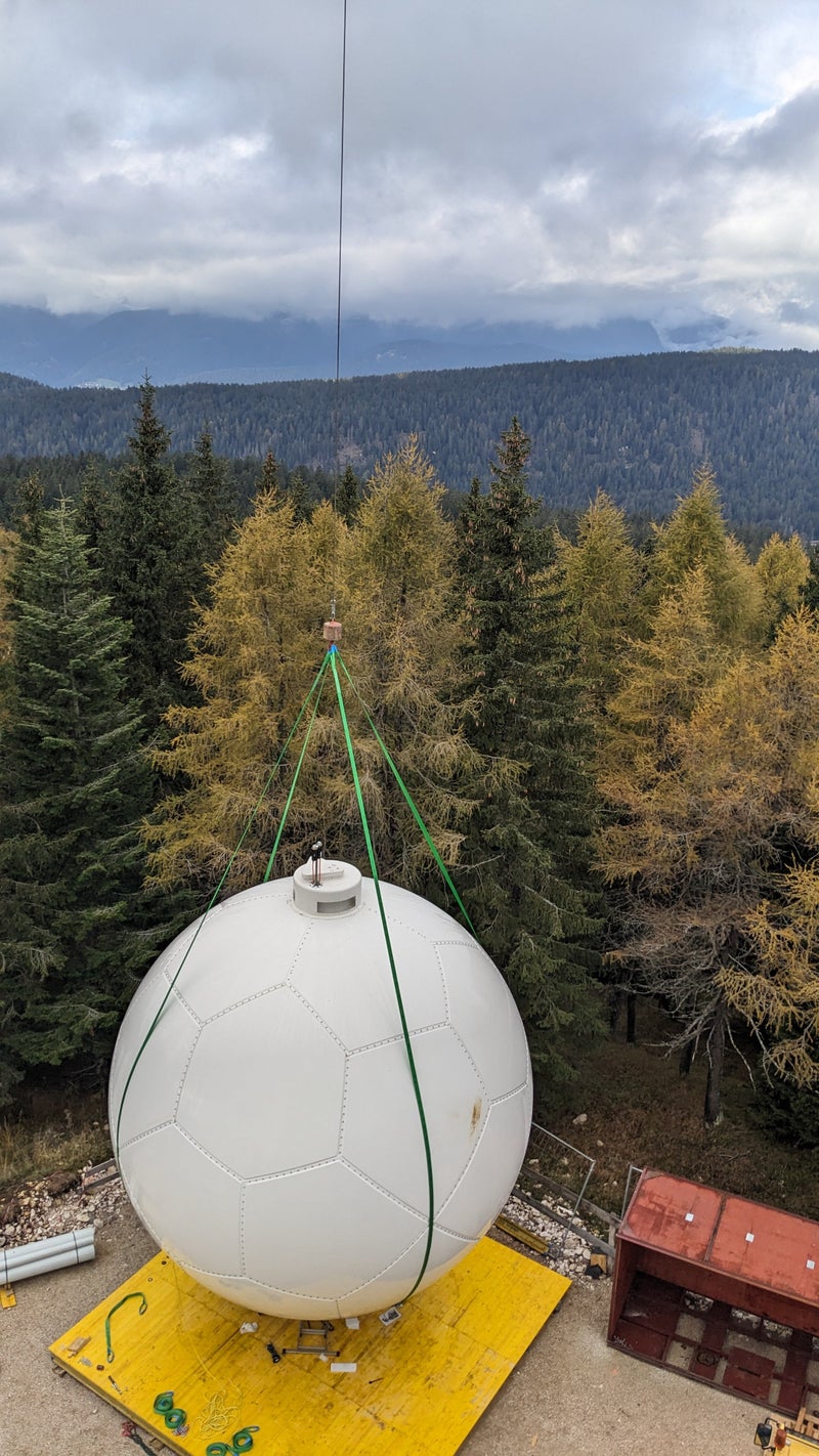 - Das Radom mit seinen fünfeckigen Modulen erinnert an einen Fußball. (Foto: LPA/Dienst für Risikoprävention und CUE Trient) » [IMG 67 kB]