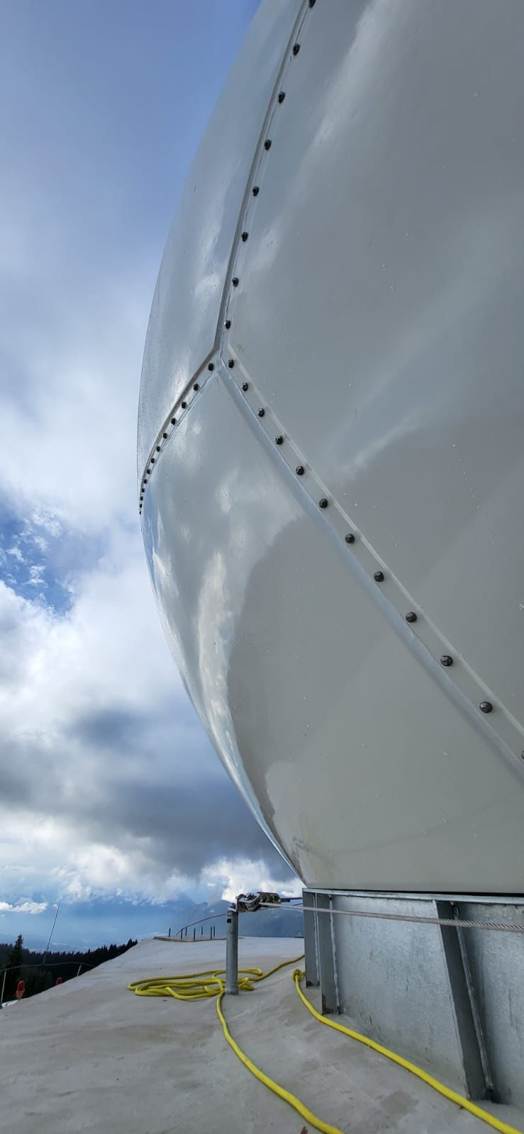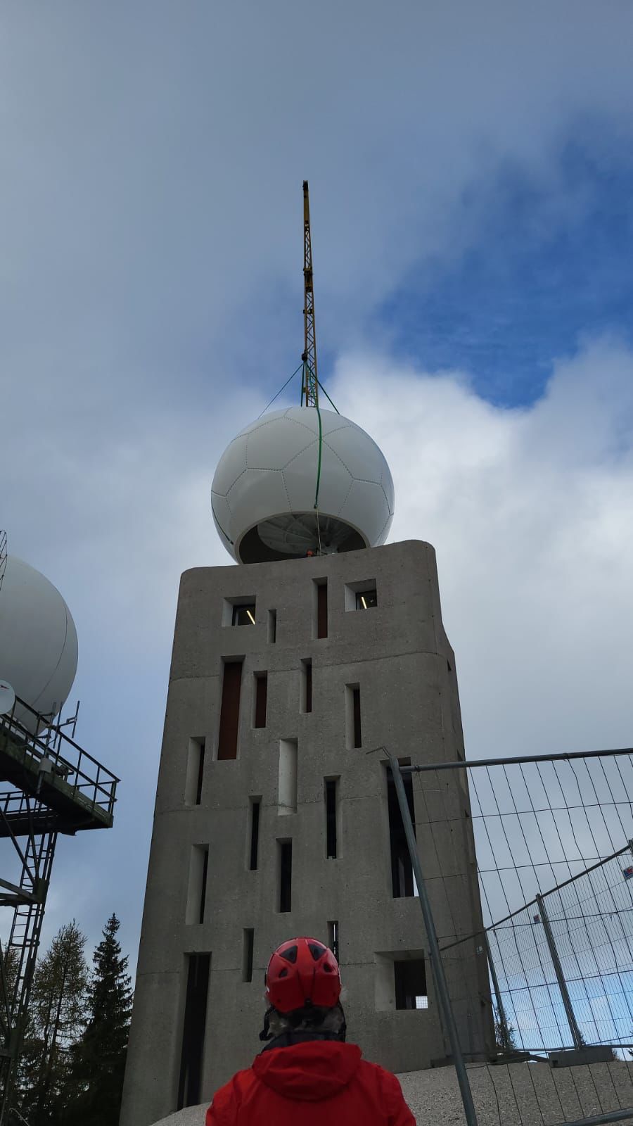 - In diesen Tagen wurde auf dem Turm aus Stahlbeton, in dem das neue Radargerät untergebracht ist, das Radom installiert, das die Antenne vor Witterungseinflüssen schützt. (Foto: LPA/Dienst für Risikoprävention und CUE Trient) » [IMG 65 kB]