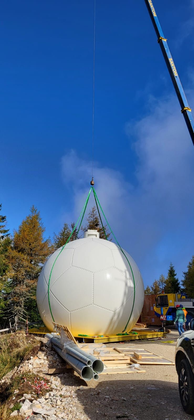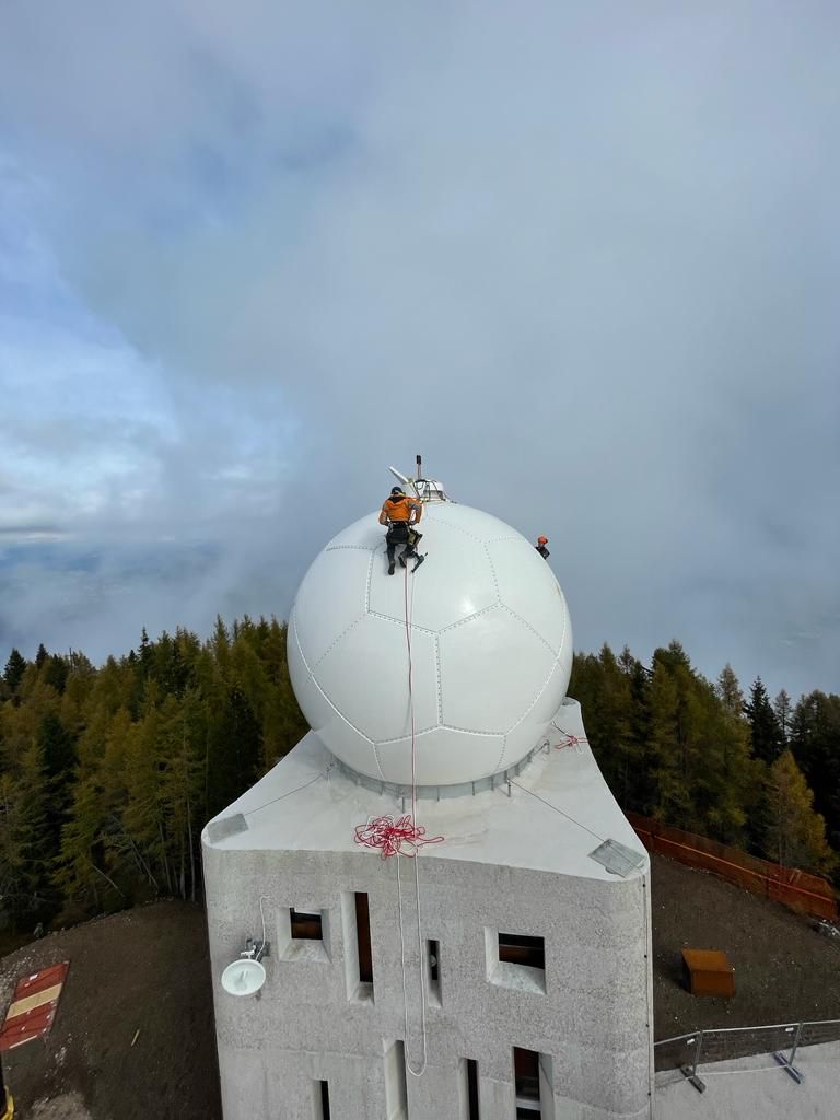 In diesen Tagen wurde auf dem Turm in Stahlbeton, in dem das neue Radargerät untergebracht ist, das Radom installiert, das die Antenne vor Witterungseinflüssen schützen soll. Das Radom, das mit einem Lastwagen auf den Berg transportiert wurde, besteht aus fünfeckigen Modulen und erinnert an einen großen Fußball. Um das Radar nicht zu stören, besteht das Radom aus einem speziellen, für das Signal durchlässigen Material, ebenso wie das gesamte installierte Blitzschutzsystem, das aus vier neun Meter hohen Pfosten an den Ecken des Turms besteht und einen faradayschen Käfig bildet.