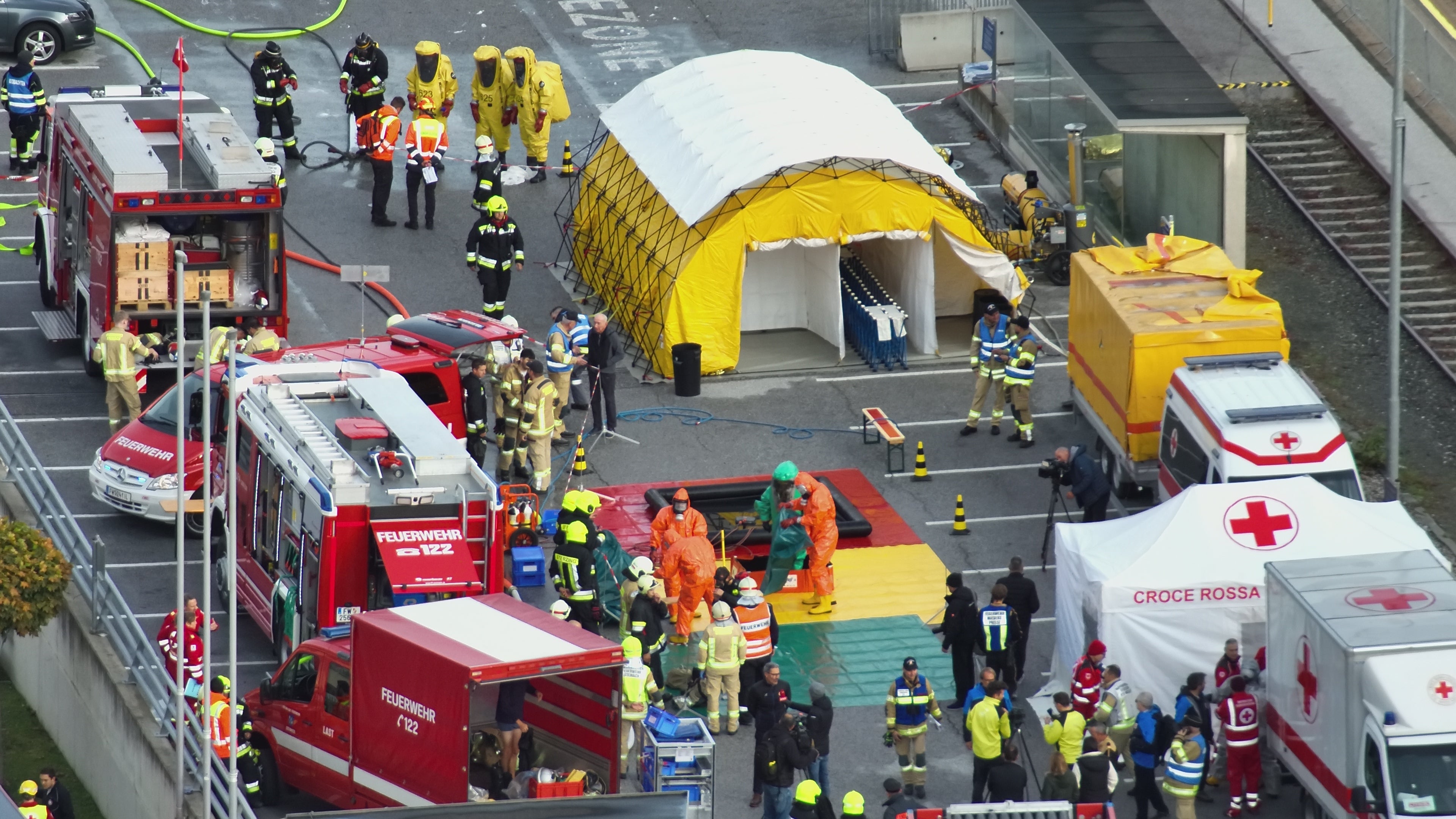 - Eines der Szenarien der grenzüberschreitenden Katastrophenschutzübung am Bahnhof in Steinach am Brenner mit Feldspital und Dekontaminations-Straße (Quelle: Drohnen-Einsatz-Gruppe Land Tirol / Landeswarnzentrale) » [IMG 3 MB]
