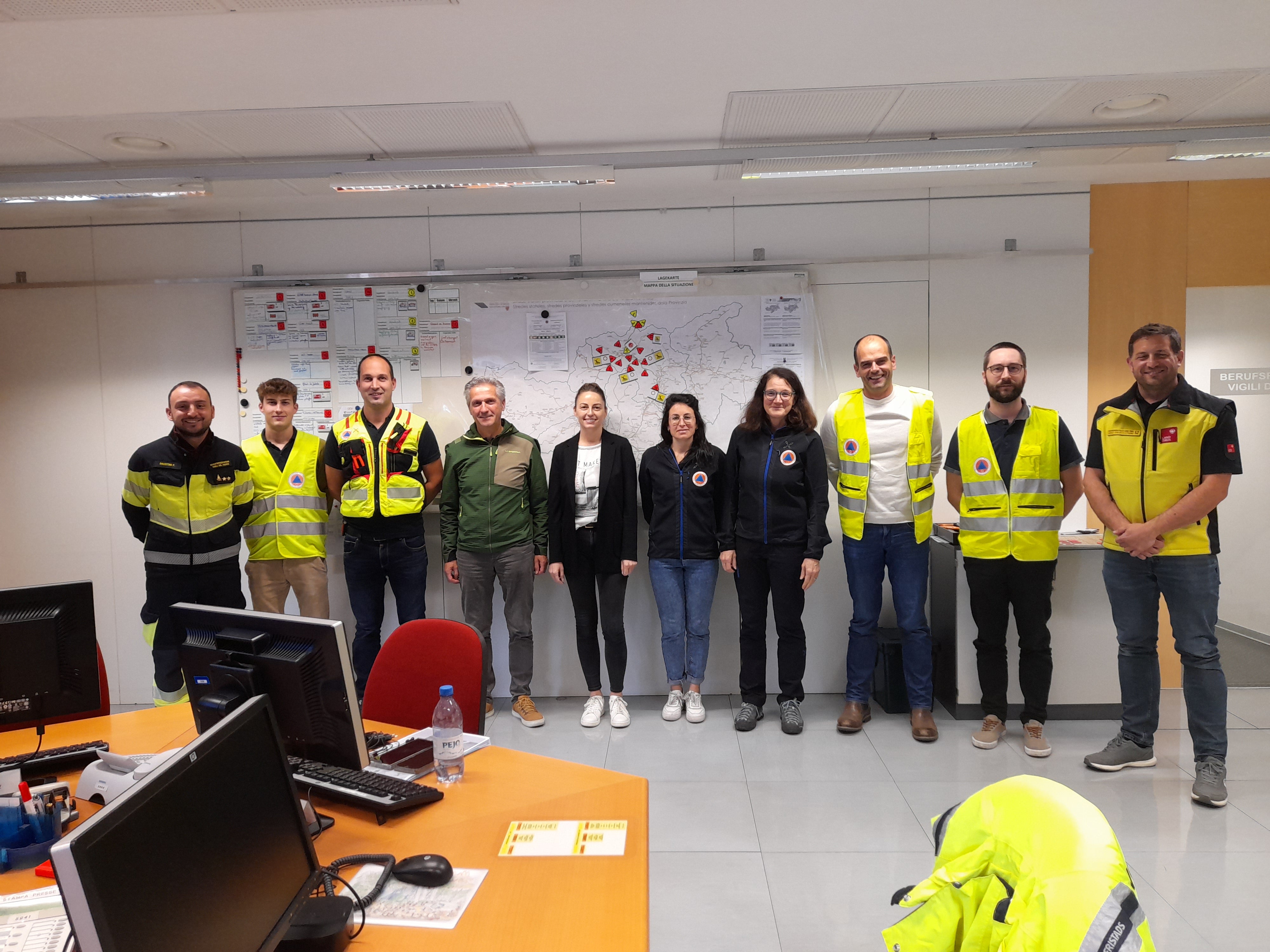 - Landeshauptmann und Bevölkerungsschutzlandesrat Arno Kompatscher (hintere Reihe, im Zentrum, links) und der Direktor der Agentur für Bevölkerungsschutz Klaus Unterweger (rechts daneben) in der Bezirkseinsatzzentrale BEZ 6 der Freiwilligen Feuerwehren in Sterzing (Foto: Landesverband der Freiwilligen Feuerwehren Südtirols) » [IMG 671 kB]