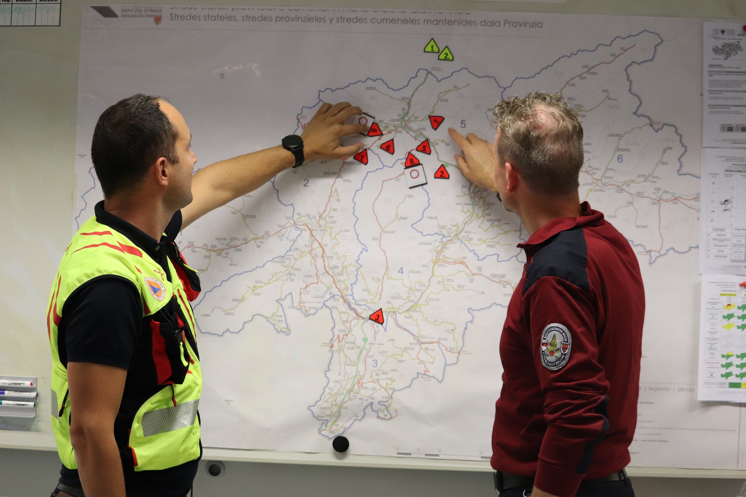 - Lagekartenführung: Während der Übung wurden die fiktiven Szenarien im Landeslagezentrum in Bozen analog auf der Südtirol-Karte festgehalten. (Foto: LPA/Maja Clara) » [IMG 1 MB]