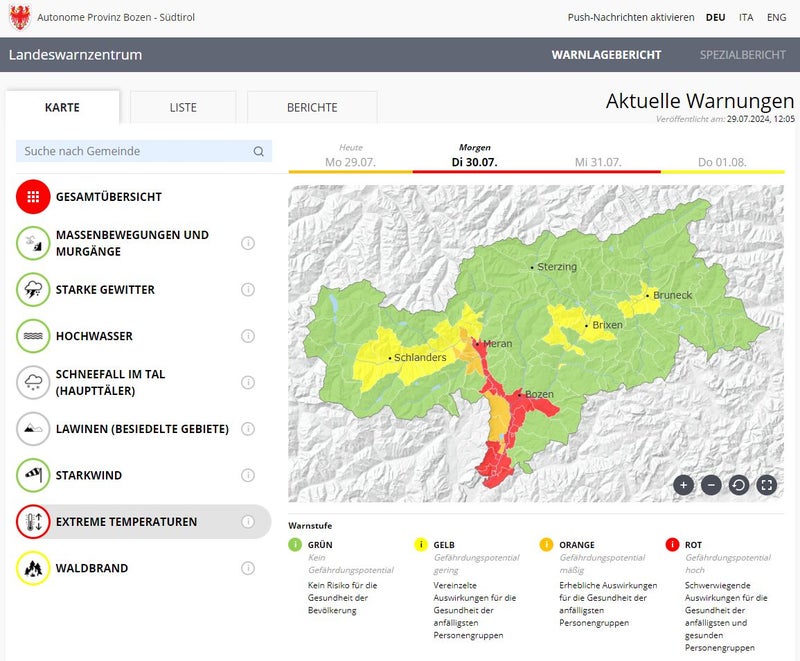 Wegen der anhaltend hohen Temperaturen in der Gemeinde Bozen und Umgebung bis Meran scheint im Warnlagebericht von morgen (30. Juli) die höchste Warnstufe Rot auf.
