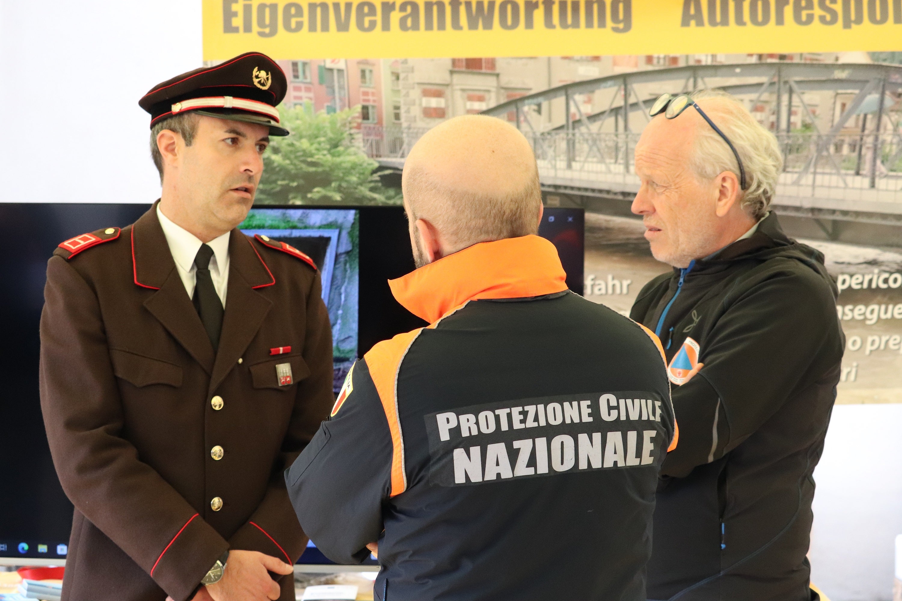 - Eigenverantwortung ist gefragt: Der Kommandant der Freiwilligen Feuerwehr Brixen Robert Burchia (li.) und der Direktor des Funktionsbereichs Wildbachverbauung in der Agentur für Bevölkerungsschutz Fabio De Polo (re.) im Gespräch mit Amtsdirektor Roberto Giarola vom gesamtstaatlichen Zivilschutz. (Foto: LPA/Maja Clara) » [IMG 1 MB]
