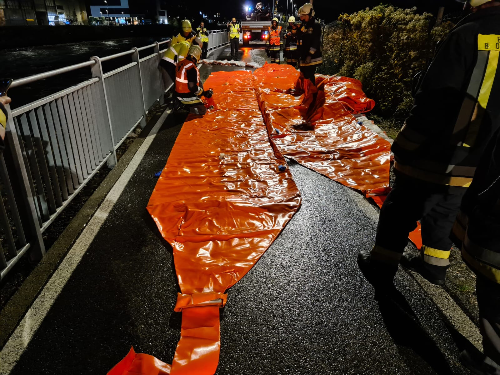 - Auf dem Radweg am rechten Eisackufer zwischen Bozen und Kardaun wurde ein Schlauchdammsystem ausgelegt. (Foto: LPA/Landesfeuerwehrverband Bezirk Bozen) » [IMG 360 kB]