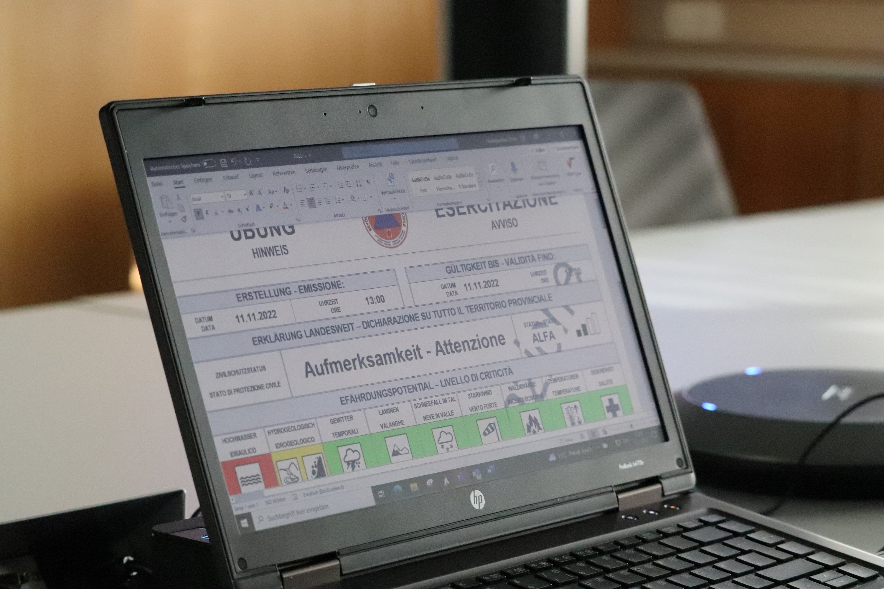 Die Übung hat heute (11. November) Mittag begonnen: Mit dem Warnlagebericht wurde fiktiv für Hochwasser die Warnstufe Rot (hohes Gefährdungspotential) in der Zone Bozen und Unterland sowie Orange (mäßiges Gefährdungspotential) im restlichen Landesgebiet ausgerufen, der Zivilschutzstatus wurde fiktiv vom Normalzustand Zero auf die Aufmerksamkeitsstufe Alfa angehoben.