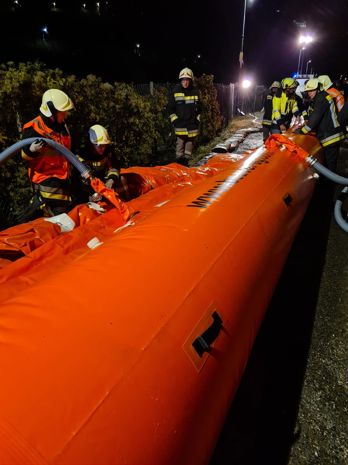 - Mit Hochwasserschläuchen wurde das Wasser am rechten Eisackufer auf der Höhe des Mila-Gebäudes in Bozen eingedämmt. (Foto: LPA/Freiwillige Feuerwehr Bozen) » [IMG 184 kB]