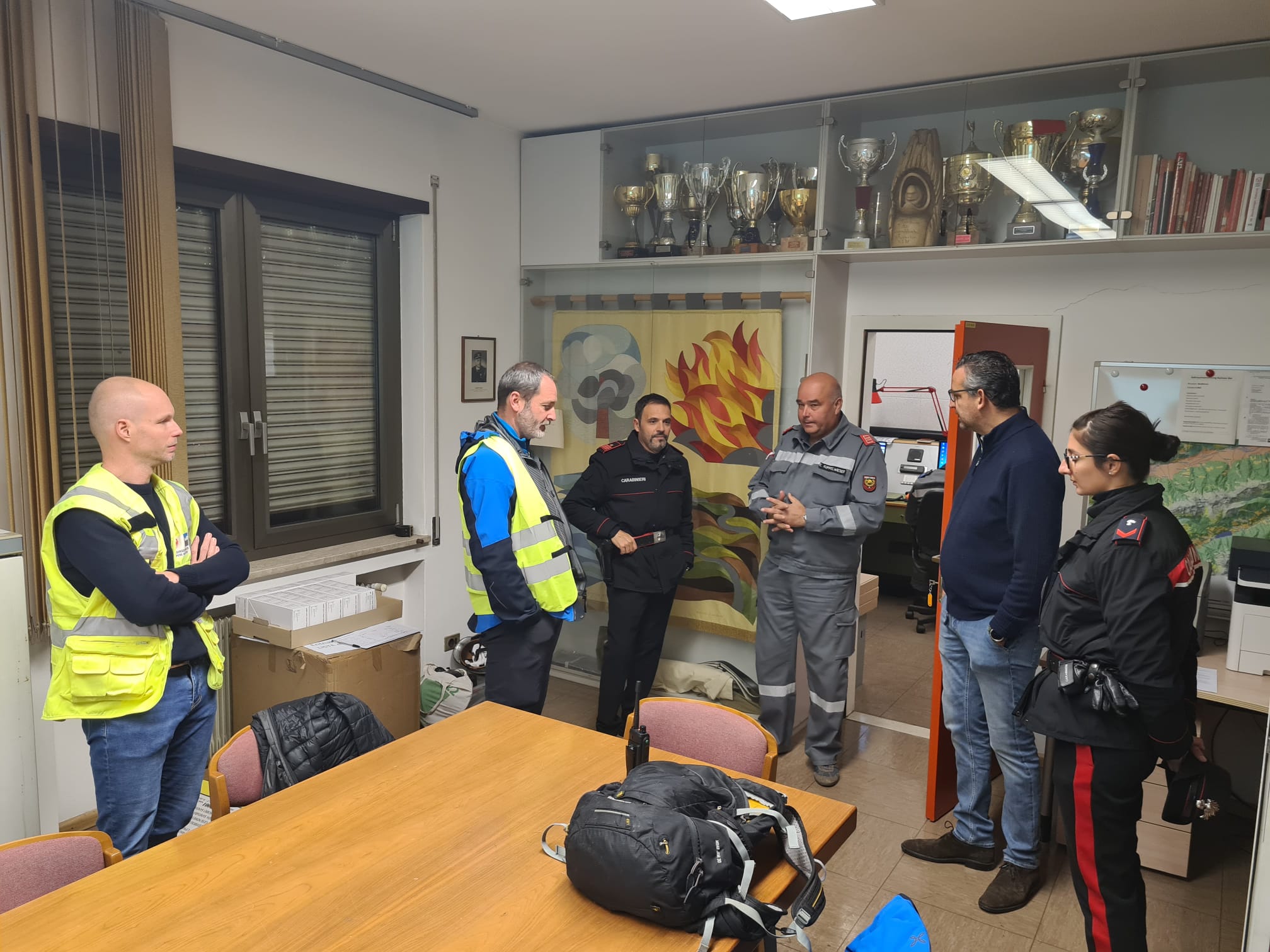 - Mitarbeiter der Alperia (stehend in der Mitte) nahmen als Beobachter an der Hochwasserübung teil; stehend ganz rechts der Organisator der Hochwasserübung und für die Lageführung Verantwortliche Hansjörg Prugg, ganz links der Direktor des Funktionsbereichs Wildbachverbauung Fabio De Polo (Foto: LPA/Maja Clara) » [IMG 2 MB]