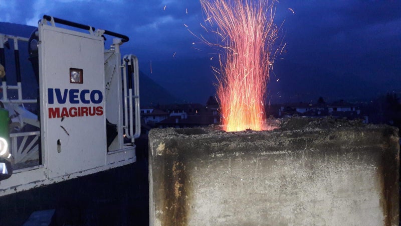 - Gerade jetzt nach einer lang anhaltenden Heizperiode ist es wichtig, Heizanlagen und Öfen zu warten, um Kaminbrände - im Bild in einer Aufnahme der Freiwilligen Feuerwehr Lana - zu vermeiden. (Foto: LPA/Landesverband der Freiwilligen Feuerwehren) » [IMG 150 kB]