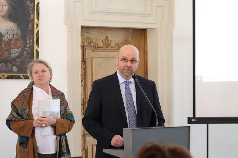 - Landeskonservatorin Karin Dalla Torre und der Direktor des Landesarchivs Gustav Pfeifer am Beginn der Pressekonferenz zur Vorstellung des Handbuchs Kulturgüterschutz im Ansitz Rottenbuch in Bozen (Foto: LPA/Maja Clara) » [IMG 1 MB]