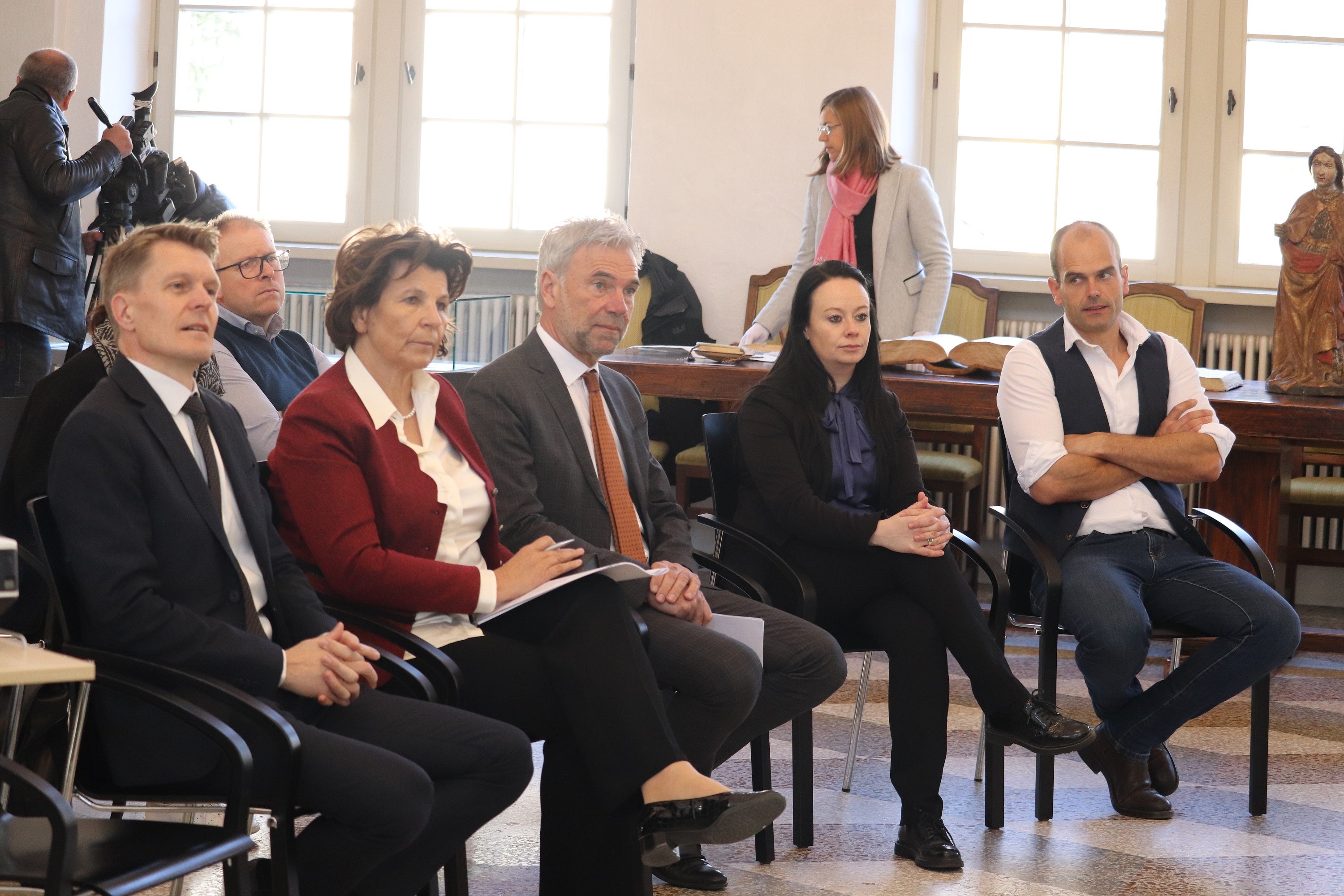 - Ressortdirektor Ulrich Stofner, Landesrätin Maria Hochgruber Kuenzer und Landesrat Arnold Schuler sowie die Direktorin des Landesamtes für Museen und museale Forschung Monika Conrater und der Direktor des Landesamtes für öffentliches Wassergut Michael Gamper (v.li.) von der Arbeitsgruppe, die das Handbuch Kulturgüterschutz erstellt hat (Foto: LPA/Maja Clara) » [IMG 1 MB]