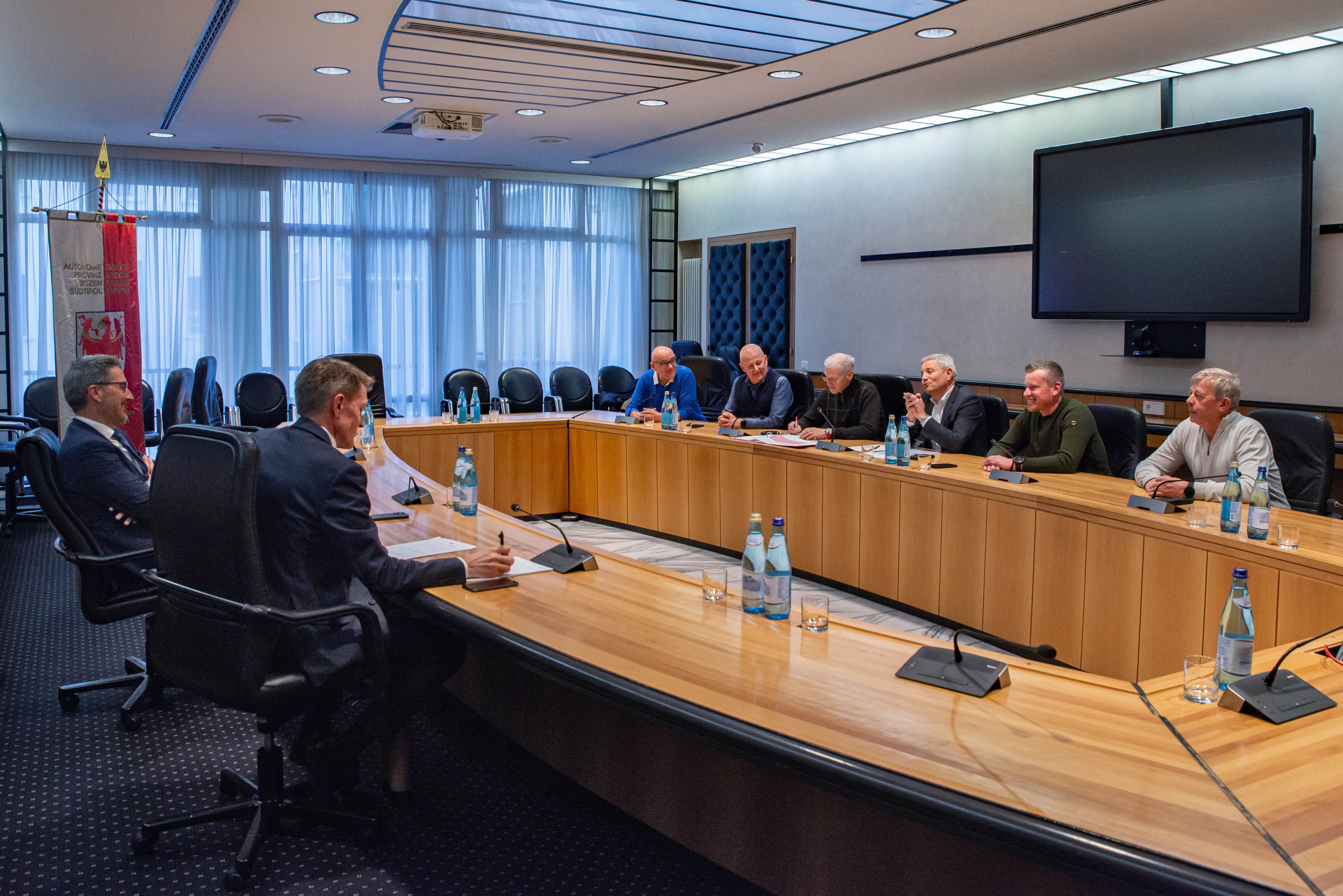 - Vollzählig kam der Vorstand des Landesverbandes der Freiwilligen Feuerwehren Südtirols LFV zum Antrittsbesuch beim für den Bereich Bevölkerungsschutz zuständigen Landeshauptmann Arno Kompatscher (Vordergrund l.) und Ressortdirektor Ulrich Stofner: (gegenüber v. l.) LFV-Vorstandsmitglieder Roman Horrer und Martin Künig, Direktor Christoph Oberhollenzer, Verbandspräsident Wolfram Gapp, Stellvertreter Peter Hellweger, Vorstandsmitglied Konrad Unterthiner (Foto: LPA/Greta Stuefer) » [IMG 1 MB]