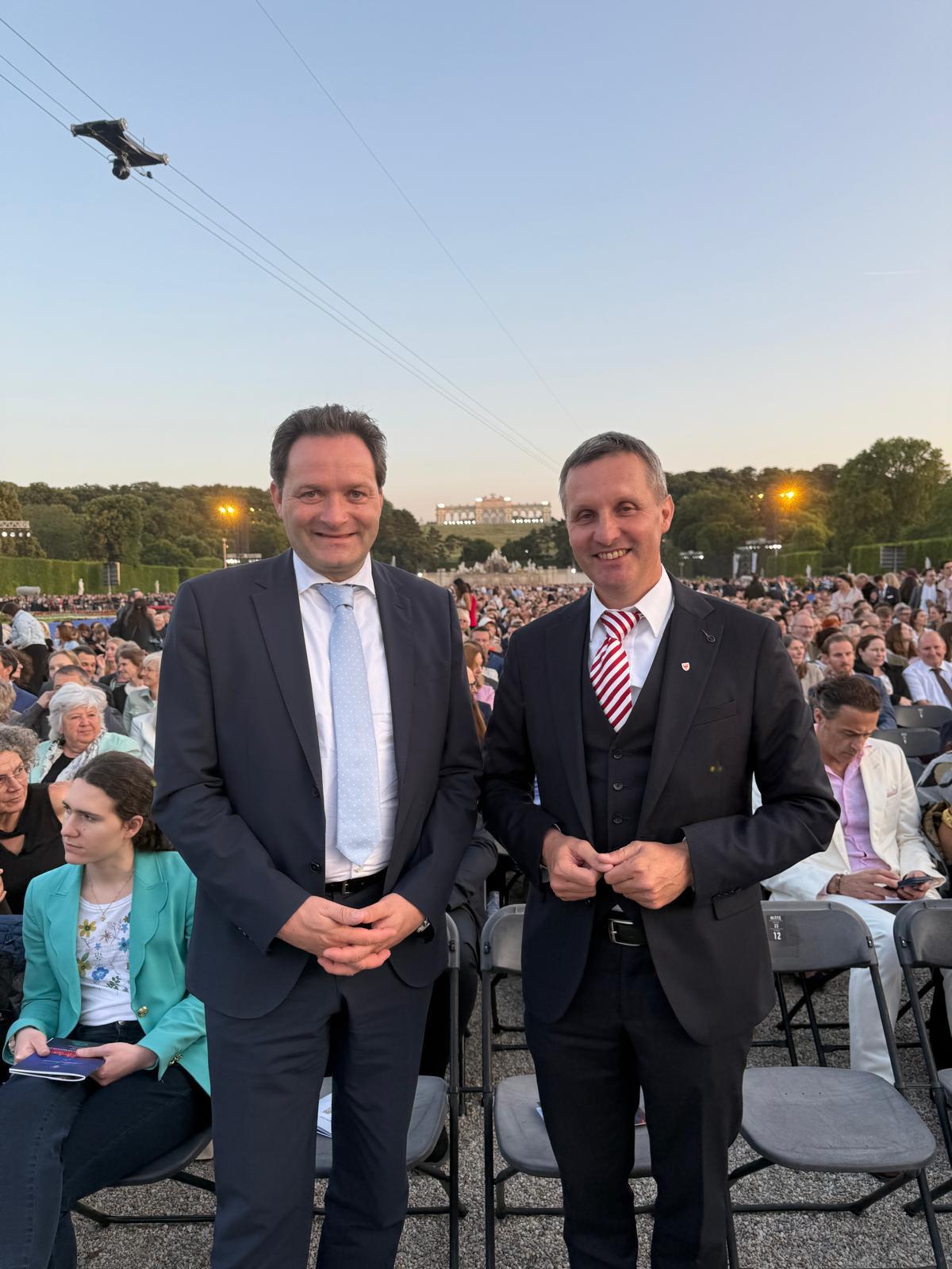 - Kultureller Ausklang: Landesrat Luis Walcher (rechts) war zum Abschluss seines Wien-Programms auf Einladung von Bundesminister Norbert Totschnig beim Sommernachtskonzert der Wiener Philharmoniker im Schlosspark von Schönbrunn zu Gast. (Foto: LPA/Bundesministerium für Land- und Forstwirtschaft, Klima- und Umweltschutz, Regionen und Wasserwirtschaft BMLUK/Kranzler) » [IMG 184 kB]