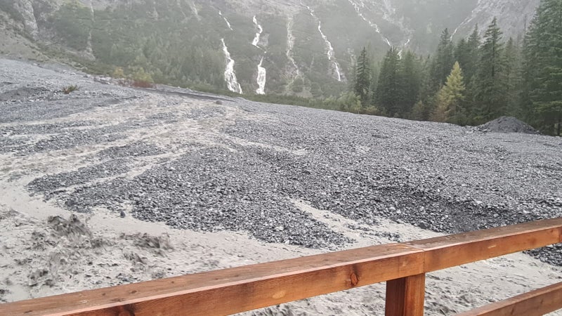 STILFS (LPA). In der Nacht auf den heutigen Montag (9. September) ist vom Eiswandfernerbach in Trafoi in der Gemeinde Stilfs eine Mure abgegangen. Der Grund dafür waren die starken Niederschläge, im Ortlergebiet sind in den vergangenen 24 Stunden über 70 mm Niederschlag gefallen. Beim Murgang wurde das Bachbett oberhalb der Fußgängerbrücke in der Nähe der "Heiligen Drei Brunnen"-Kirche vollständig mit Geschiebematerial aufgefüllt. "Wir haben einen großen Bagger vor Ort und versuchen, das Bachbett unter der Brücke frei zu schöpfen, damit diese nicht total übermurt oder weggeschwemmt wird", informiert Peter Egger, Direktor des Amtes für Wildbach- und Lawinenverbauung West in der Agentur für Bevölkerungsschutz. Derzeit sei jedoch der Abtransport von Material nicht möglich, weil auch die Zufahrtsstraße an einer Stelle unterbrochen ist.