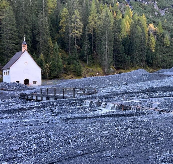 - Eines der dokumentierten Ereignisse im soeben erschienenen Report Naturgefahren: Ende August 2023 ist vom Eiswandfernerbach in Trafoi in der Gemeinde Stilfs eine Mure abgegangen, die Wallfahrtskirche zu den Heiligen Dri Brunnen wurde vom Murgang nicht beschädigt. (Foto: LPA/Landesamt für Wildbach- und Lawinenverbauung West) » [IMG 215 kB]