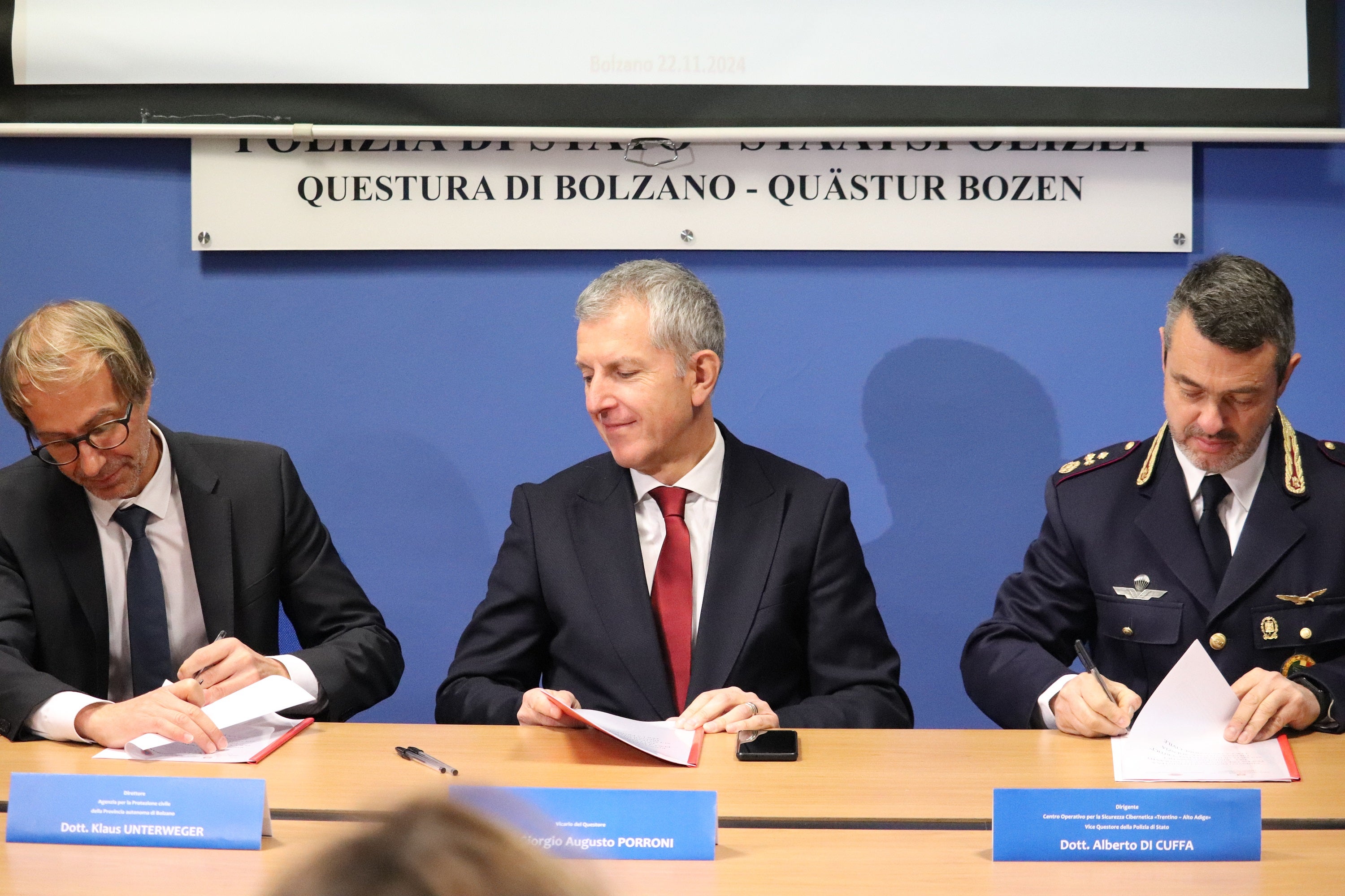 Die Verlängerung der vor drei Jahren geschlossenen Vereinbarung unterzeichneten heute (22. November) der Leiter des Einsatzzentrums der Post - und Kommunikationspolizei von Trentino-Südtirol Alberto Di Cuffa und der Direktor der Agentur für Bevölkerungsschutz Klaus Unterweger.