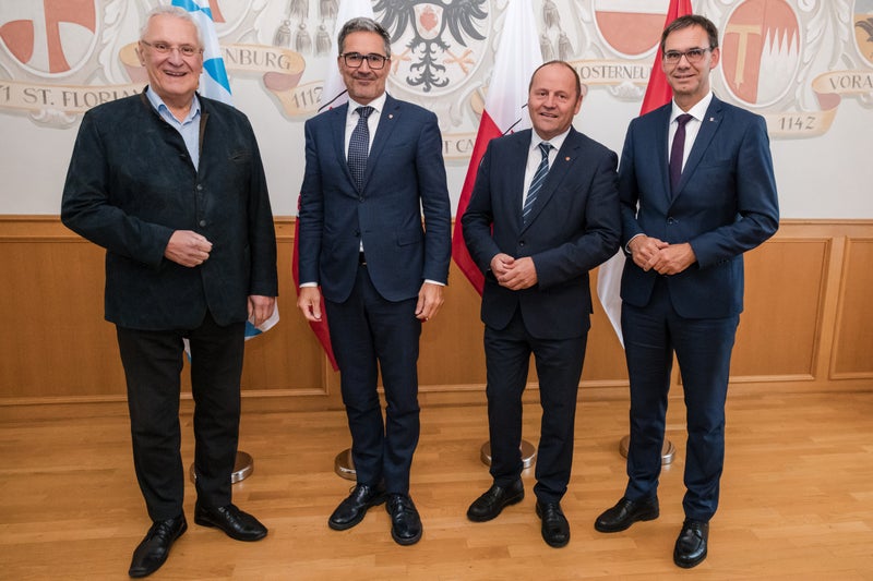 Bayerns Innenminister Joachim Herrmann (von links), Landeshauptmann Arno Kompatscher, der stellvertretende Landeshauptmann des Landes Tirol, Josef Geisler, und der Landeshauptmann von Vorarlberg, Markus Wallner trafen sich zu Gesprächen im Kloster Neustift. (Foto: LPA/Bernhard Aichner)