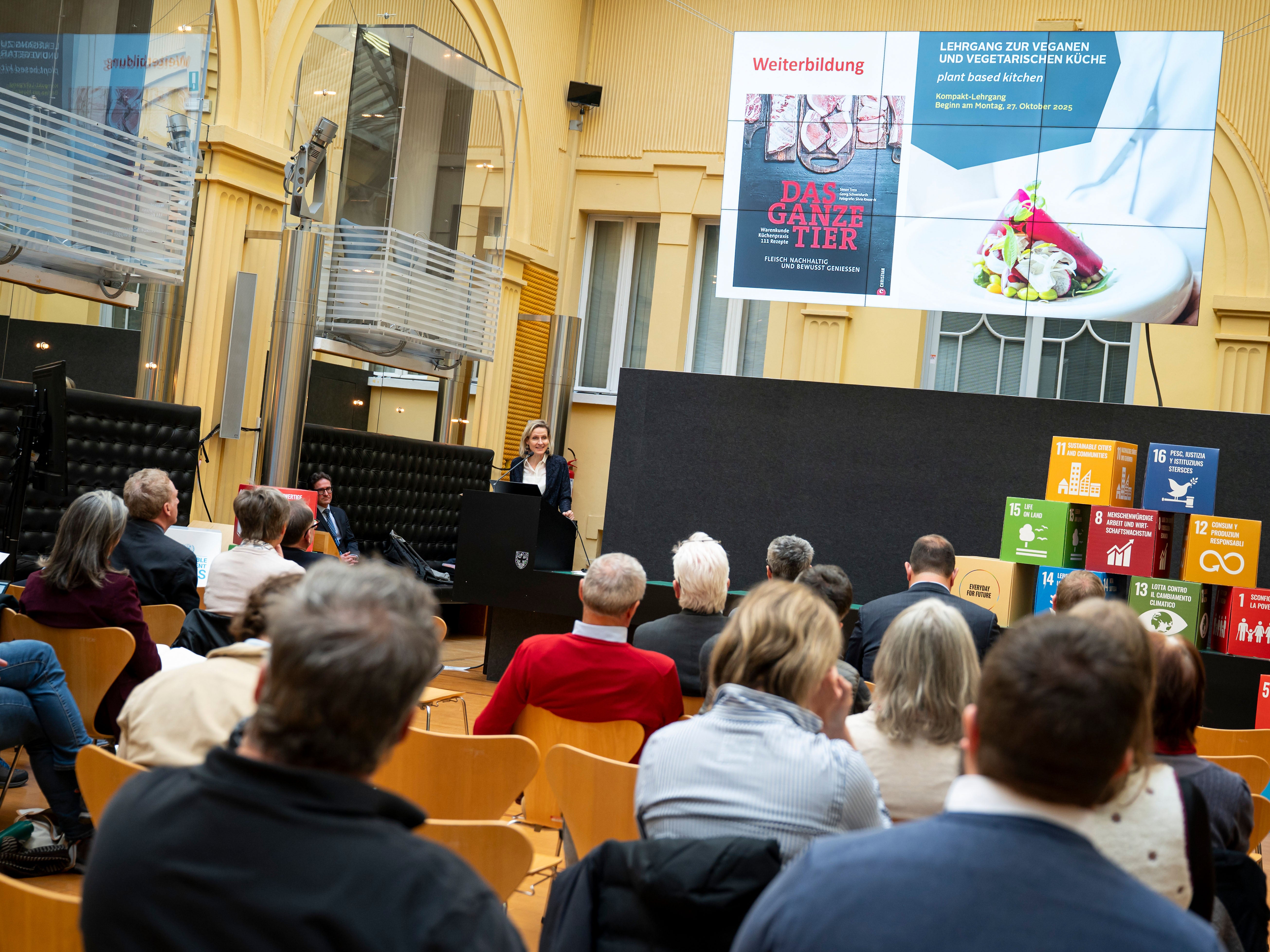 - Auch die Gastronomie spielt eine zentrale Rolle: Eine stärker pflanzenbasierte, saisonale und regionale Menügestaltung kann die Nachfrage gezielt beeinflussen und nachhaltige Entscheidungen für Gäste sichtbarer machen. Im Bild: Bettina Schmid vom Hoteliers- und Gastwirteverband HGV. (Foto: LPA/Fabio Brucculeri) » [IMG 2 MB]
