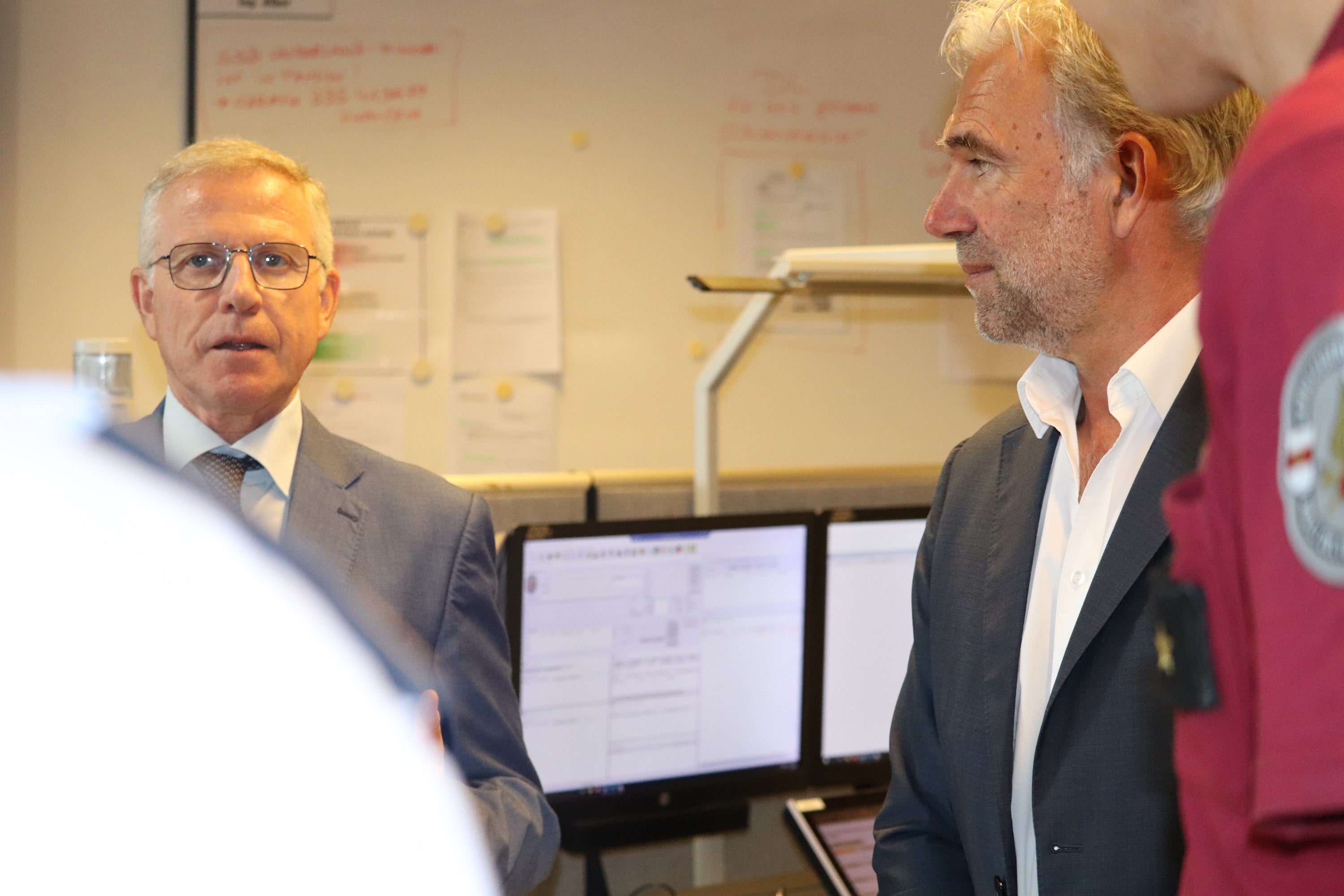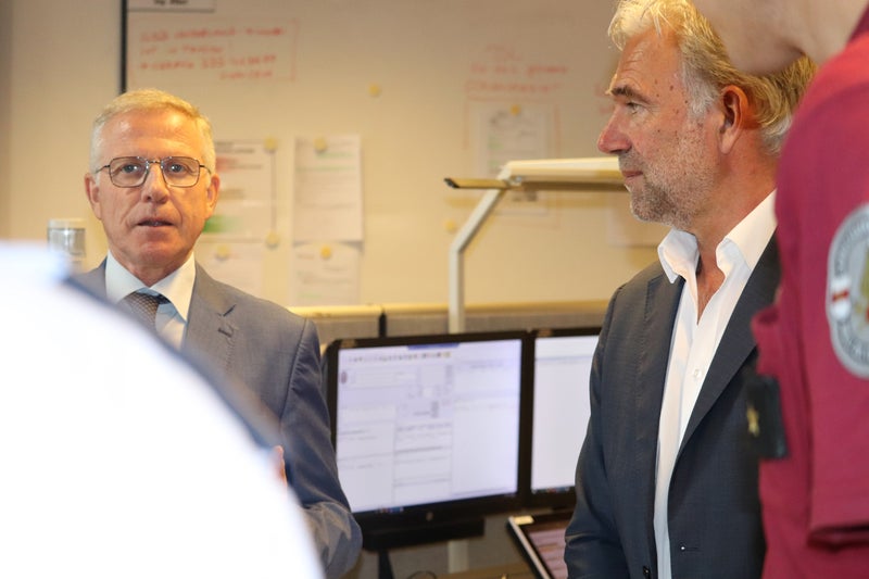 - Mittsommerfeiertagsbesuch: Regierungskommissär Vito Cusumano mit Landesrat Arnold Schuler (l.) in der Landesnotrufzentrale (Foto: LPA/Maja Clara) » [IMG 1 MB]