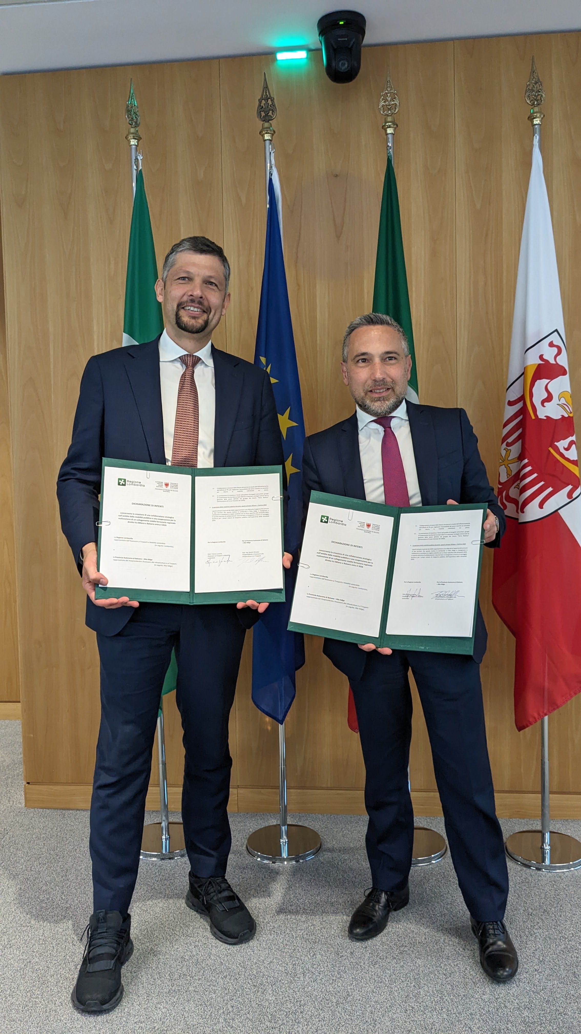 - Mobilitätslandesrat Daniel Alfreider und der Assessor der Region Lombardei Franco Lucente nach der Unterzeichnung der Vereinbarung für den neuen RegioExpress Bozen-Mailand. (Foto: Eleonora Tommasi/Regione Lombardia) » [IMG 1 MB]