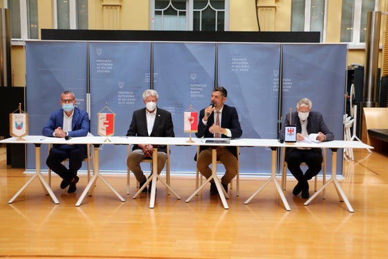 v.l.: Bianchi, Caramaschi, LR Alfreider und Berger unterzeichnen die gesellschaftliche Nebenvereinbarung, die den betroffenen Gemeinden Mitspracherecht sichert. (Foto: LPA/Ingo Dejaco)