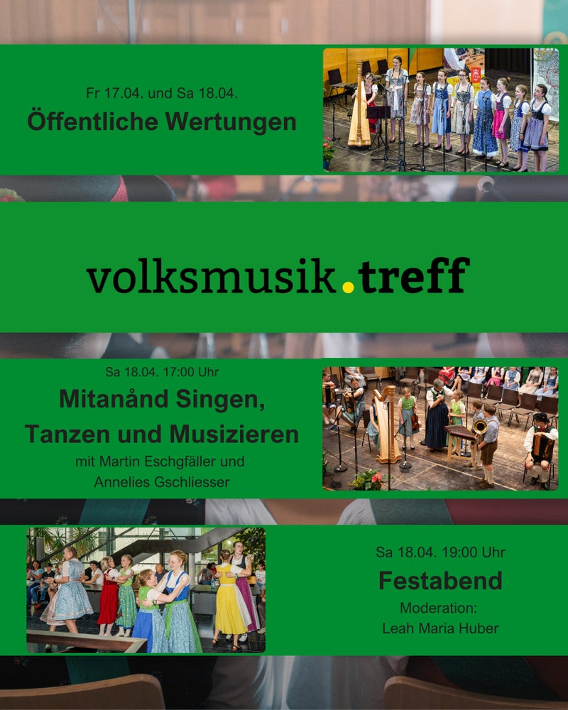 Am Samstag runden ein Offenes Singen, Musizieren und Tanzen um 17 Uhr sowie der Festabend mit Urkundenübergabe um 19 Uhr den Wettbewerb ab. Der "volksmusik.treff" ist als ein Ort für geselliges Beisammensein und spontanes gemeinsames Musizieren die Neuheit der heurigen Ausgabe des Wettbewerbes. Dort sind der Südtiroler Volksmusikverein und das Referat Volksmusik mit Ständen vertreten und auch verschiedene Instrumentenbauer vor Ort.
