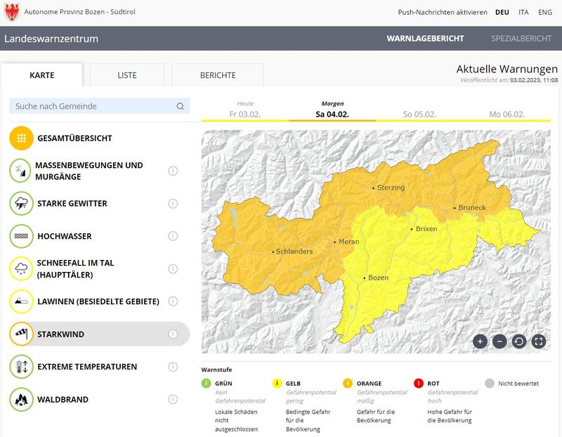 Das Landeswarnzentrum in der Agentur für Bevölkerungsschutz veröffentlicht täglich den Warnlagebericht, in dem das Gefährdungspotential von Naturgefahren bewertet und mittels vier Alarmstufen dargestellt wird. warnungen.provinz.bz.it
