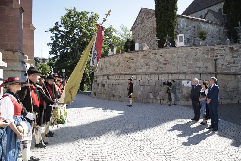 - Landesüblicher Tiroler Empfang der Schützenkompanie "Erzherzog Johann" für (gegenüber stehend v.l.) LH Schützenhöfer, Bürgermeisterin Pichler und LH Kompatscher (Foto: LPA/Tiberio Sorvillo) » [IMG 4 MB]