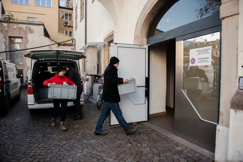 - Gemeinsam luden Herwig Prinoth (Bildvordergrund) und Petra Kranebitter (rote Jacke) die Fundstücke im Bozner Naturmuseum ab. (Foto: LPA/Claudia Corrent) » [IMG 5 MB]