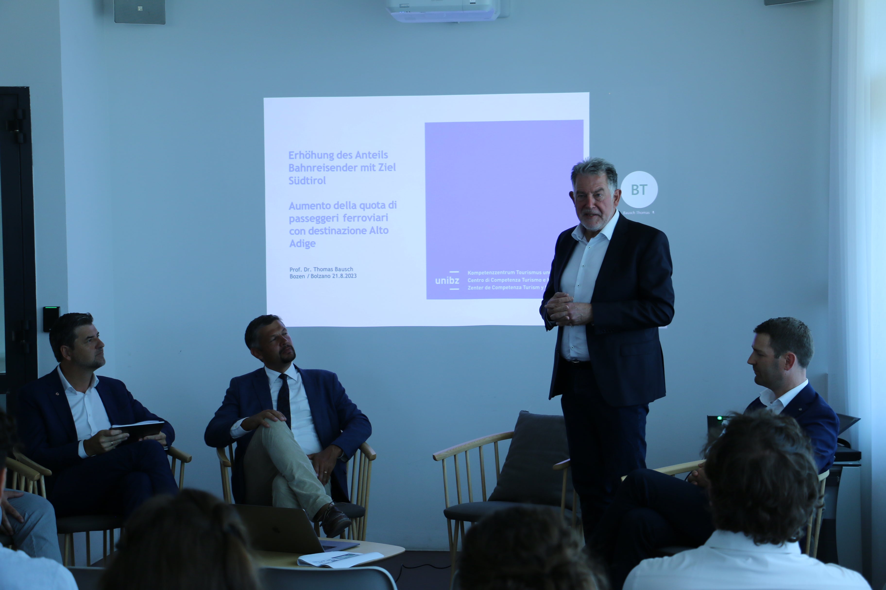 - Professor Bausch (stehend): "Generell können sich rund 40 Prozent der Urlaubsgäste die Anreise mit dem Zug vorstellen." (Foto: LPA/Patrick Thaler) » [IMG 2 MB]