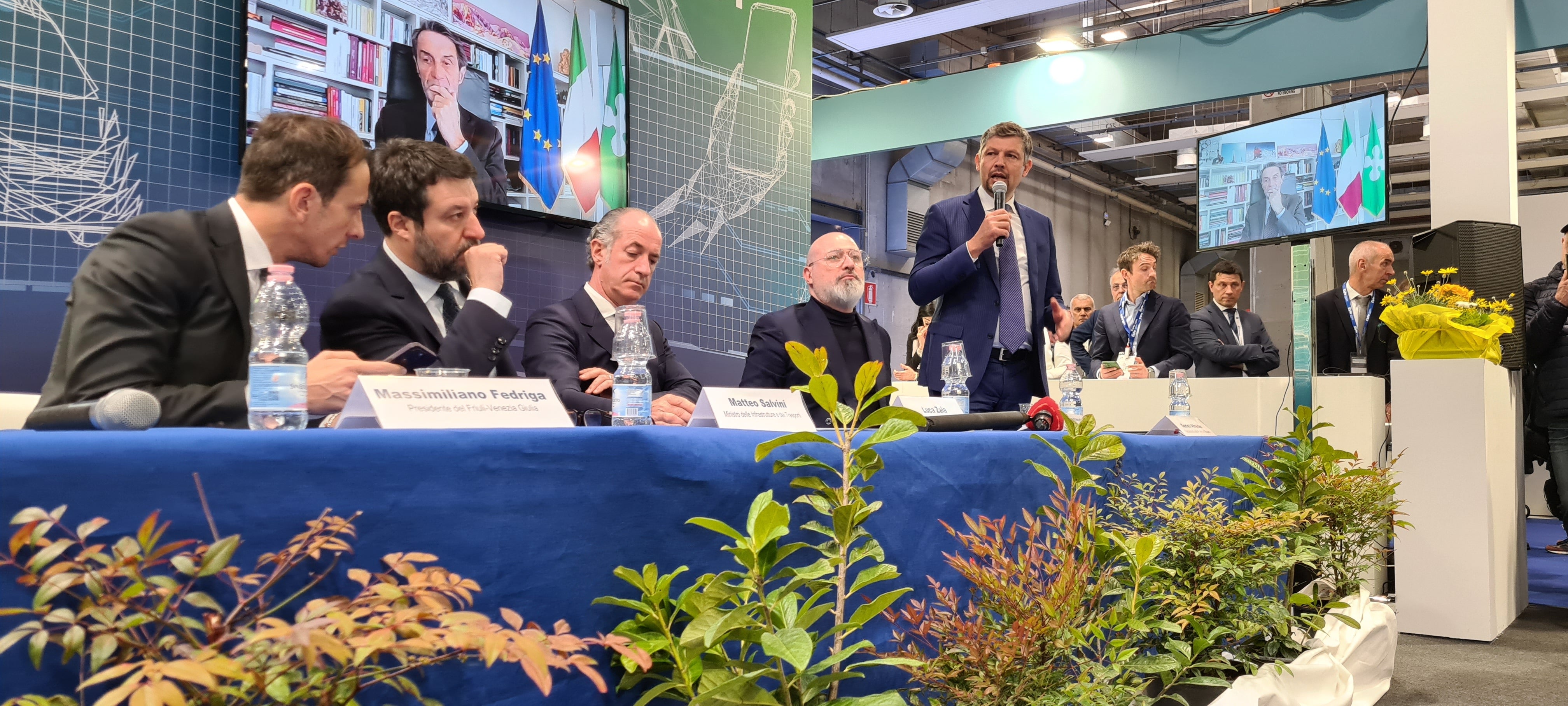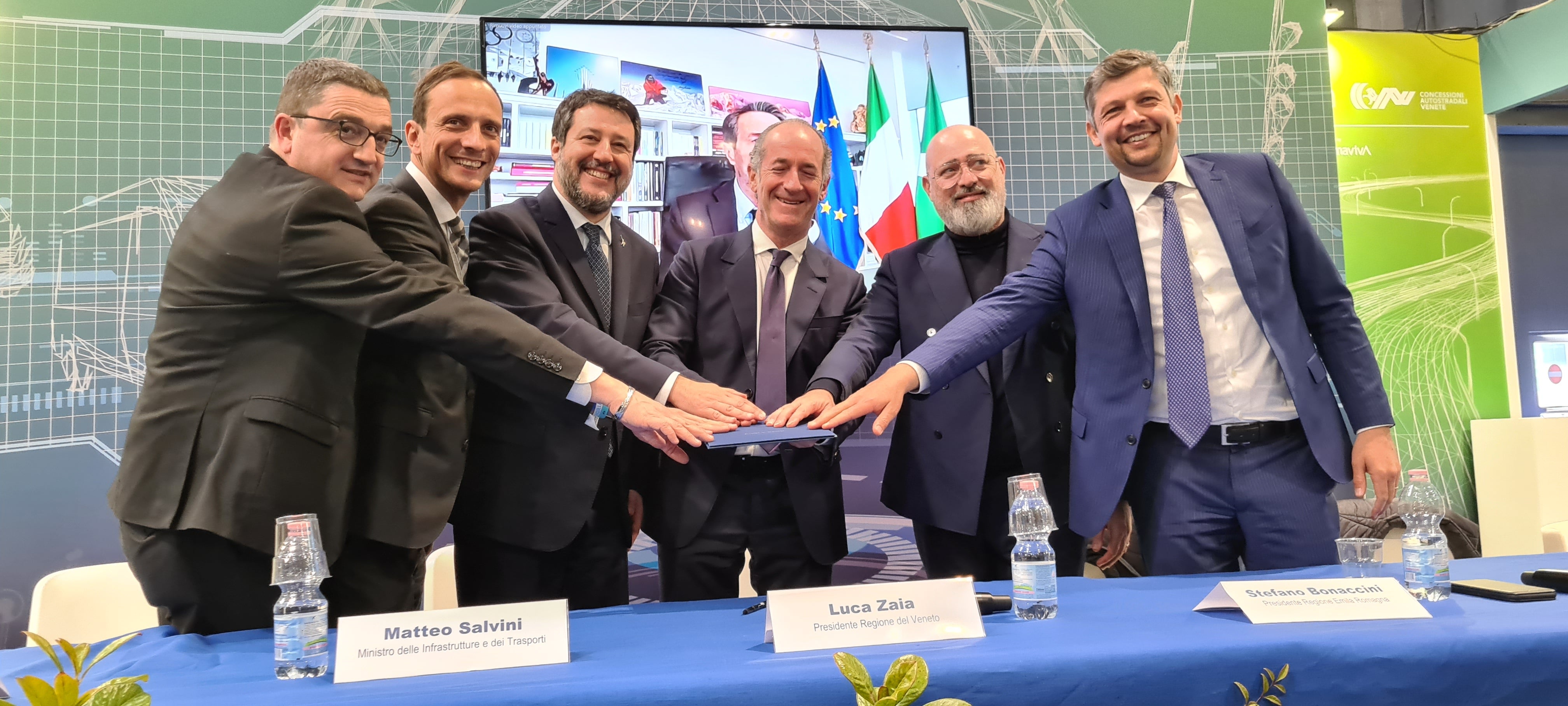 - Gemeinsam für die Logistik der Zukunft (v.l.): LH Fugatti (Trentino), Präsident Fedriga (Friaul-Julisch Venetien), Minister Salvini, Präs. Zaia (Venetien), Präs. Bonaccini (Emilia-Romagna), Präs. Fontana (Lombardei, zugeschaltet) und LR Alfreider (Südtirol). (Foto: Presseamt Region Trentino-Südtirol/Davide Cordua) » [IMG 1 MB]