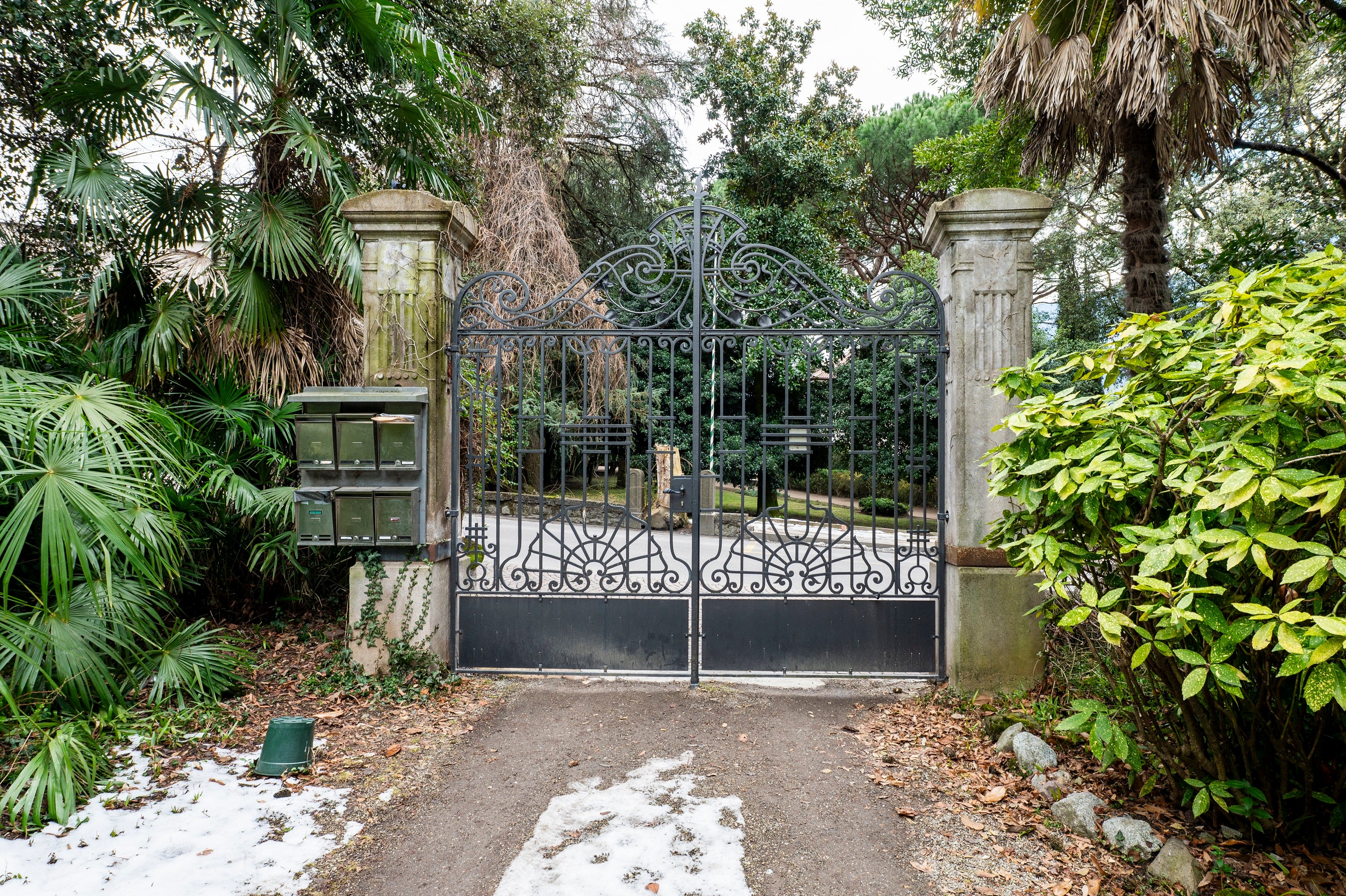 - Das Anwesen wird von einem schmiedeeisernen Gitter zwischen gemauerten Säulen begrenzt. (Foto: Landesdenkmalamt/Manuela Tessaro) » [IMG 3 MB]