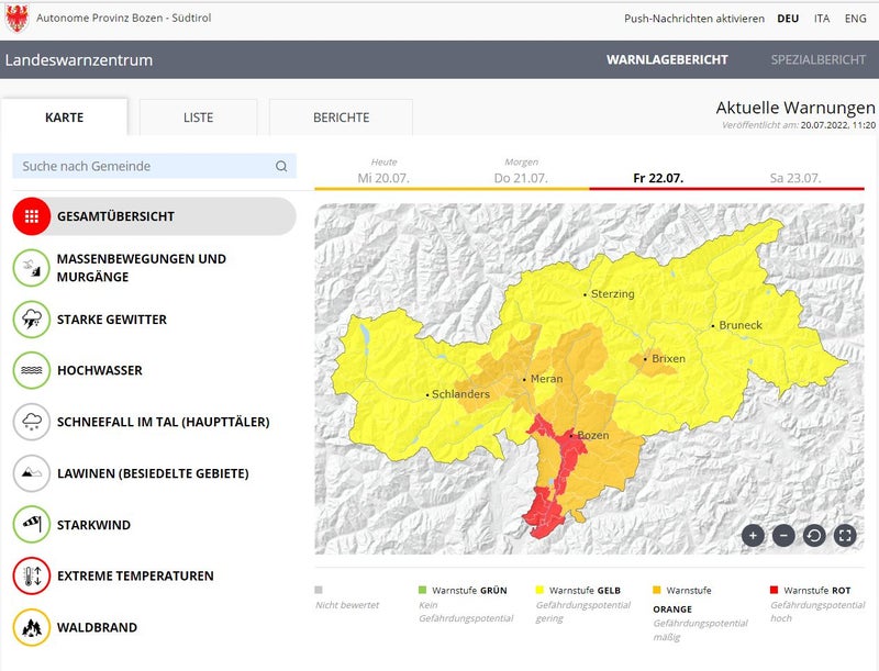 Die Stufe Rot im Warnlagebericht des Landeswarnzentrums steht für hohes Gefährdungspotential und gilt am Freitag (22. Juli) und Samstag wegen extremer Temperaturen im Großraum Bozen.