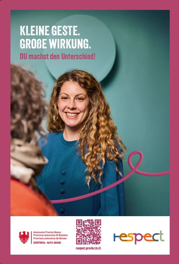BOZEN (LPA). Ein Lächeln oder eine kleine Geste können den Tag verschönern und tun der Gesellschaft gut – genau da setzt die Kommunikationsinitiative des Landes "Respect. Kleine Geste, große Wirkung – du machst den Unterschied" an. Zum Welttag des Respekts am 18. September erinnert das Land Südtirol daran, wie wichtig Respekt im Alltag ist. Gemeinsam mit vielen Partnerinnen und Partnern werden im Rahmen der Kommunikationsinitiative seit Mai dieses Jahres Aktionen gesetzt, die zeigen: Jede und jeder kann den Unterschied machen. Ziel ist es, ein freundliches Miteinander zu fördern und Zivilcourage zu stärken, wie es auch im Regierungsprogramm der Landesregierung vorgesehen ist.