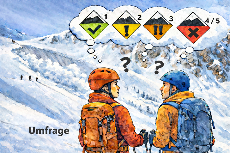 Die European Avalanche Warning Services EAWS überarbeiten derzeit die Lawinengefahrenskala, um deren Verständlichkeit und Wirksamkeit zu verbessern. Dazu sammeln sie Erkenntnisse aus der Community und laden Nutzerinnen und Nutzer zur Teilnahme an der Umfrage ein, die rund 10 Minuten in Anspruch nimmt: Dieser Link führt zur Umfrage in deutscher Sprache.