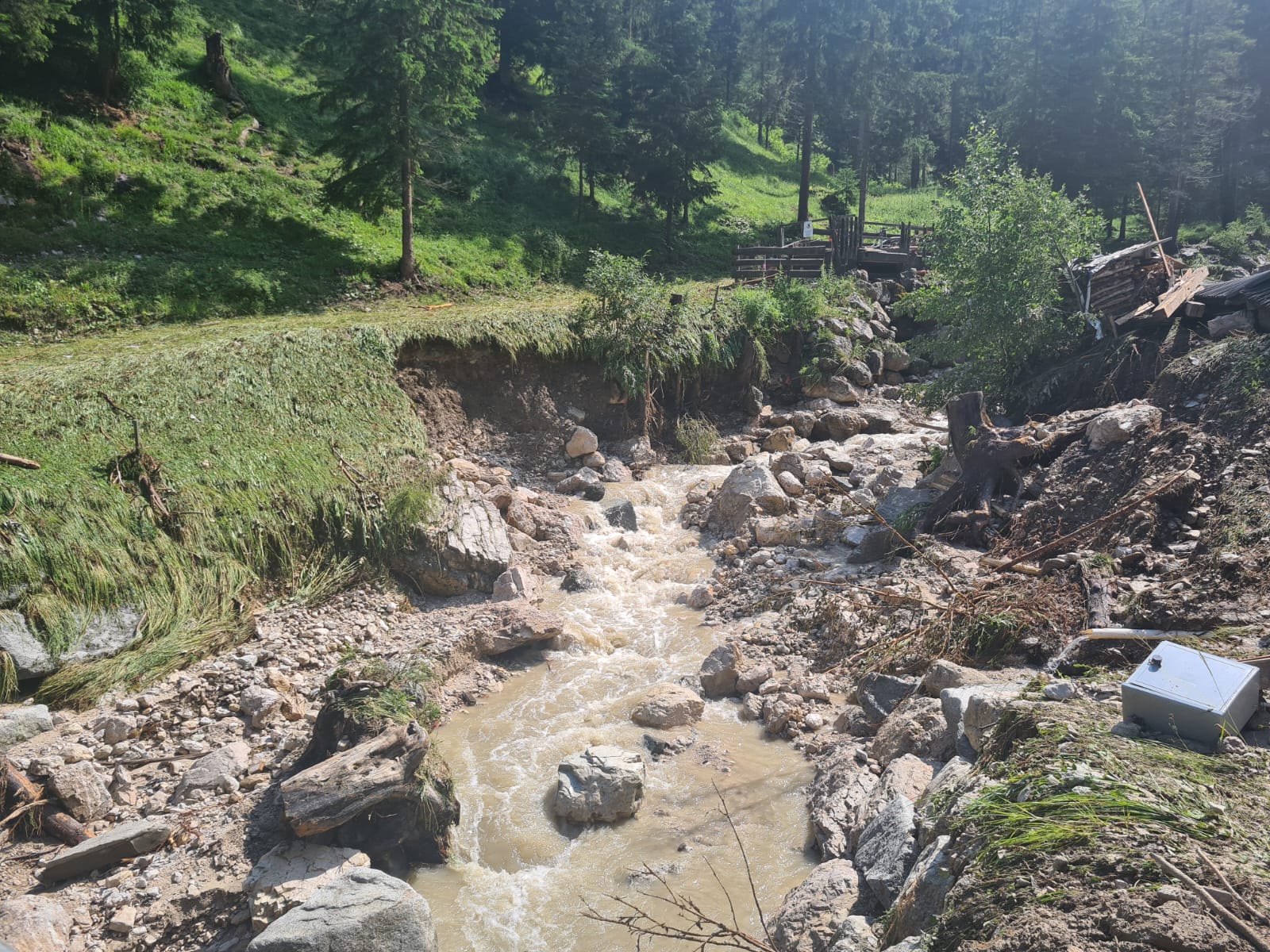 - Mehrere Uferbereiche wurden nach dem Starkregenereignis im Wengener Bach unterspült, die Wildbachverbauung hat unverzüglich mit Instandsetzungsarbeiten begonnen, um den Hochwasserschutz wieder zu verstärken. (Foto: LPA/Landesamt für Wildbach- und Lawinenverbauung Ost in der Agentur für Bevölkerungsschutz) » [IMG 474 kB]