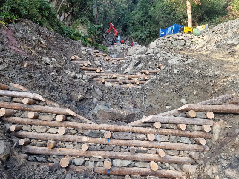 Nachdem die Arbeiten im Herbst wegen anhaltender Niederschläge und dem dadurch aufgeweichten Boden unterbrochen werden mussten, wurden sie heuer im Frühjahr fortgesetzt. Unterhalb der Gittersperren verbauten die Wildbacharbeiter den Graben mit Holzkrainerwänden und verwendeten dafür auch die Steine vor Ort. Sie bauten auch einige Querungen ein. Weiters stabilisierten sie eine seitliche Rinne.